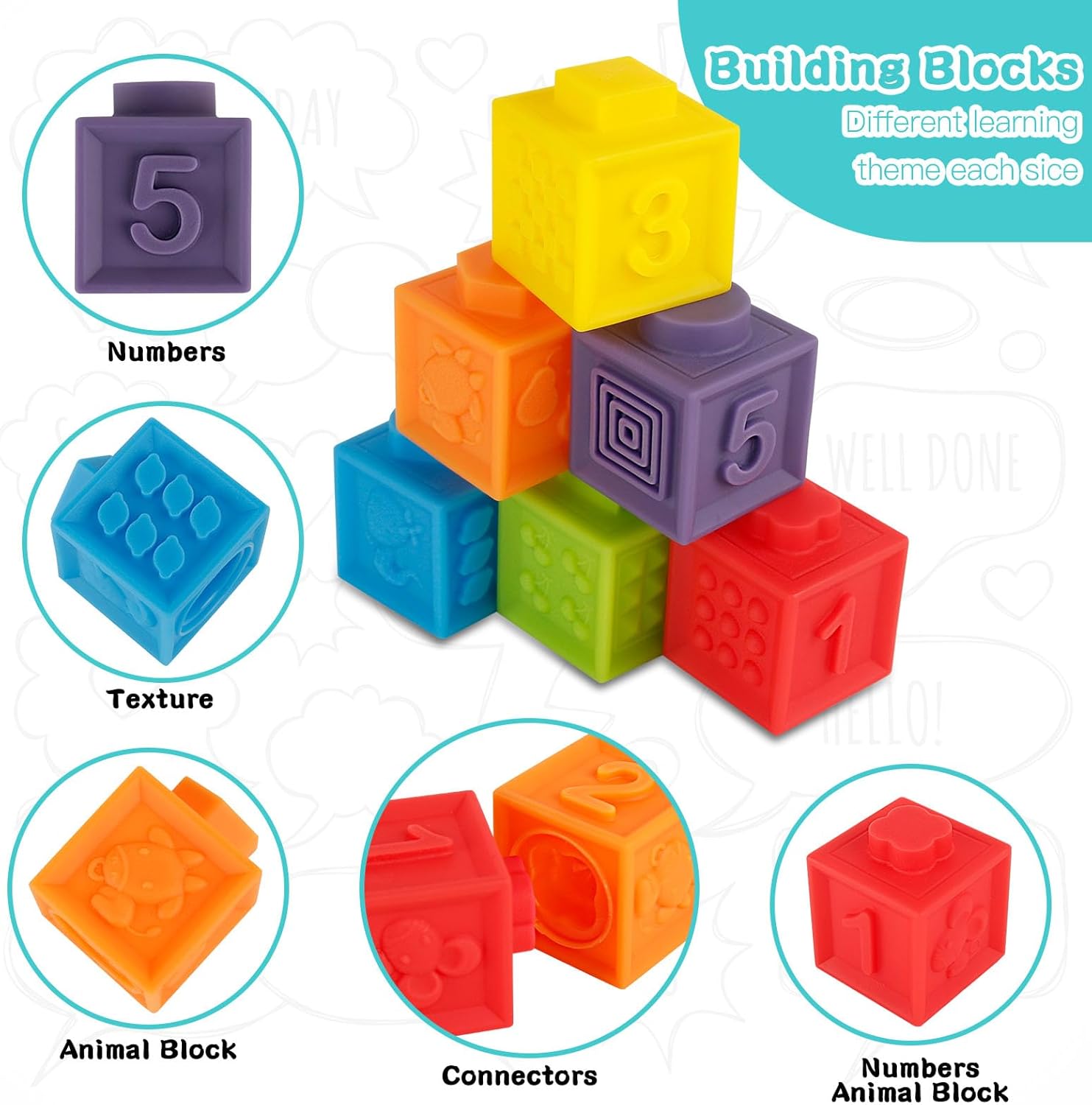 Early Learning Play – These toddler toys are great for toddlers learning colors, shapes, textures, counting. Baby can match the shapes, learn the numbers, these are arouse their creativity and imagination. The bright colors which inspire baby’s vision development, build color recognition.