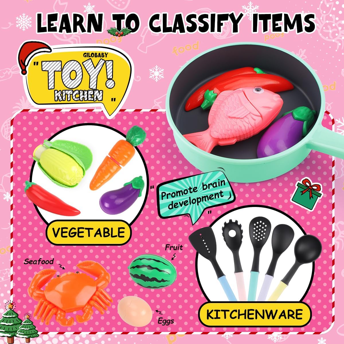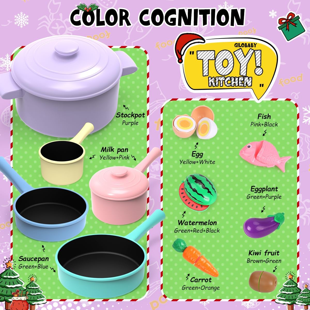 Comprehensive Accessories: The play food sets for kids kitchen include colorful cookware pots and pans, egg, cabbage, carrot, chili pepper, kiwi, watermelon, eggplant, fish, crab, toy kitchen knives and cooking utensils
