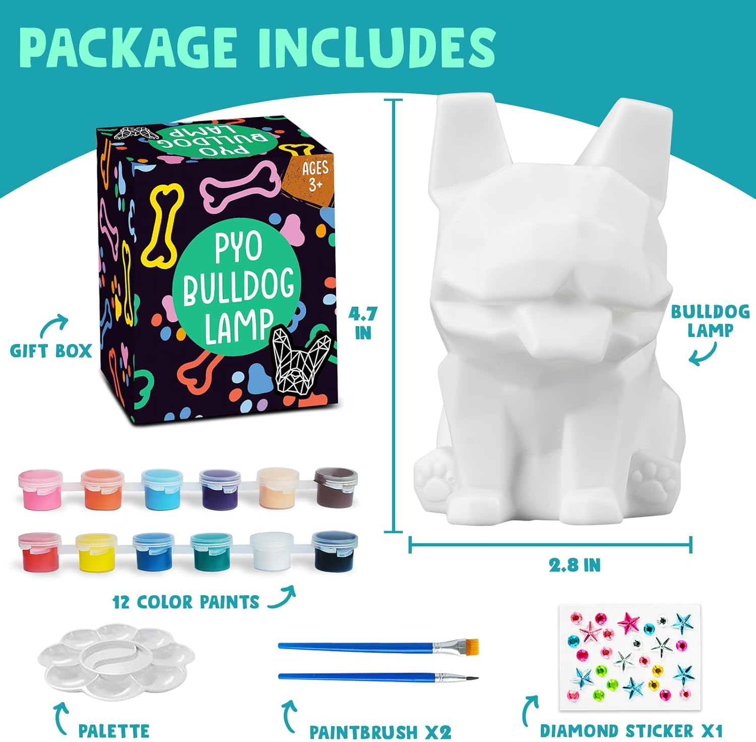 🐶【Creative Bulldog Craft Fun】Dive into the world of creativity with our Paint Your Own Bull Dog Lamp kit! This set includes 1 dog lamp, 12 paint colors, 2 brushes, a palette and sticker. Perfect for dog art and crafts for teens, this kit promises hours of fun and creativity for arts and crafts enthusiasts aged 4-12.