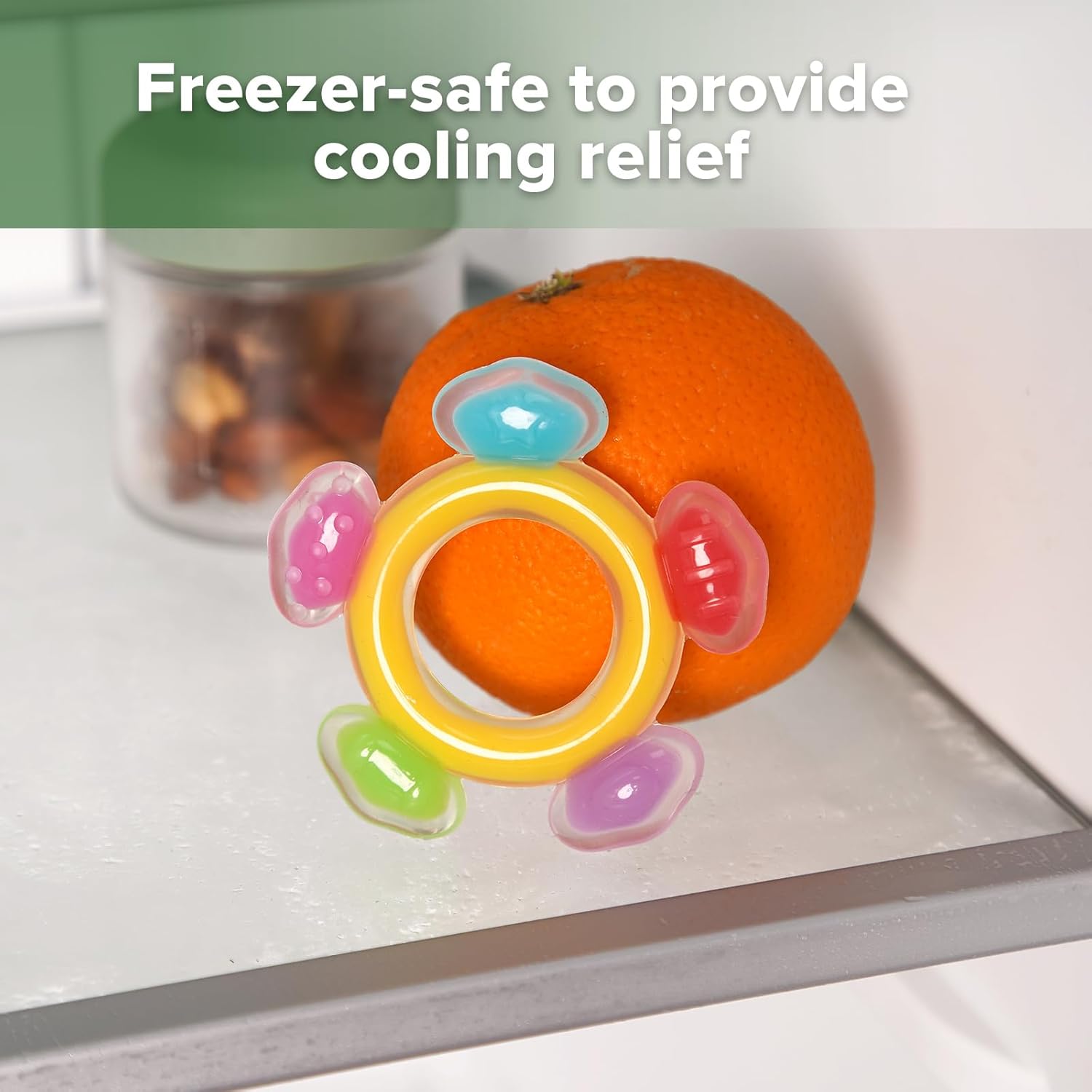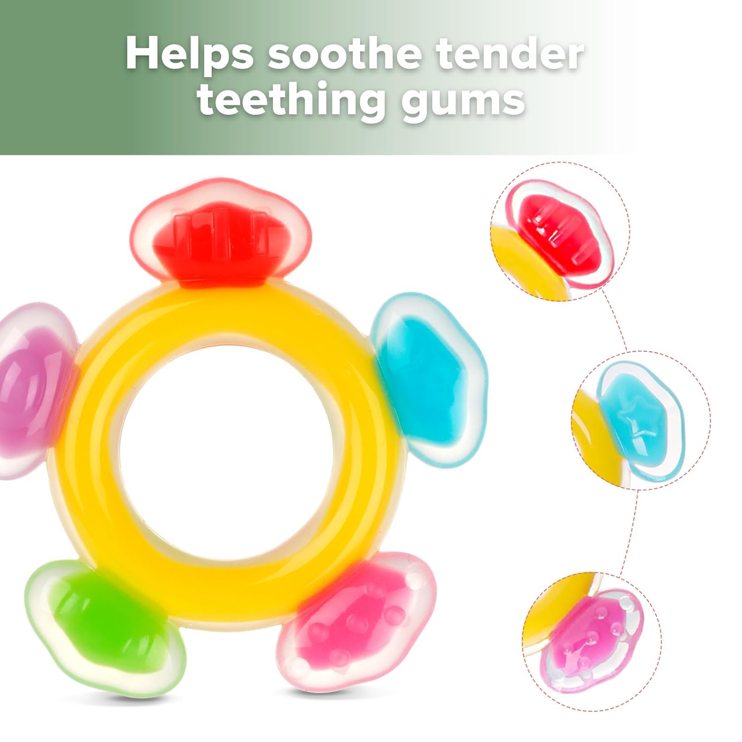 FREEZER TEETHING TOYS:Our freezer-friendly teether can be easily frozen to offer a soothing, cool relief. Help your baby ease the pain and discomfort of teething with our cold teethers, perfect for babies 3-6 months and above.