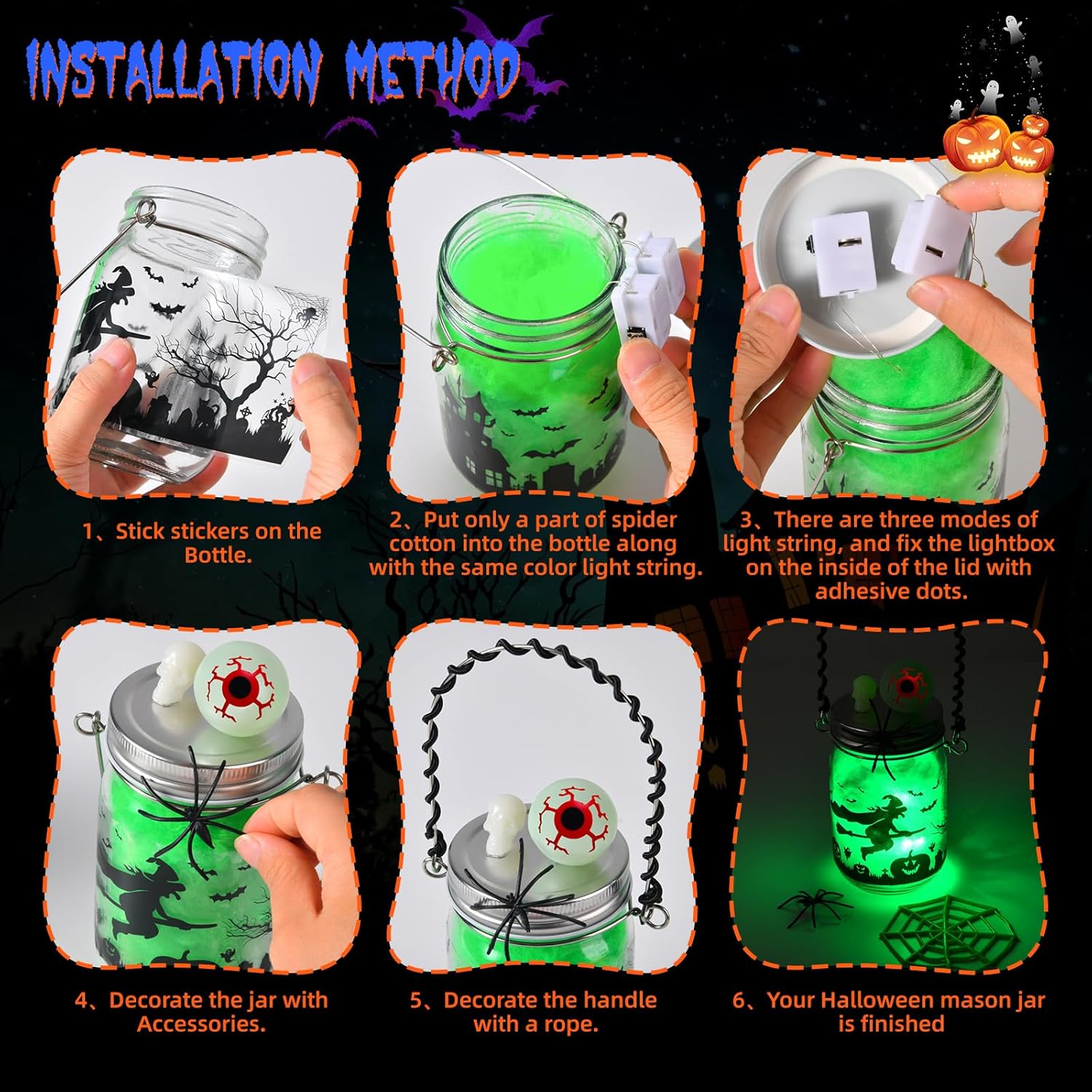 Fun and Enjoy Your Halloween Night: These illuminated Halloween crafts are easy to make, and children can freely add various accessories they want to the jar and decorate it with Halloween stickers and light strings, enjoying the fun of creation. Children can also take them out to play, and they are easy to carry. Suitable for indoor or outdoor use.