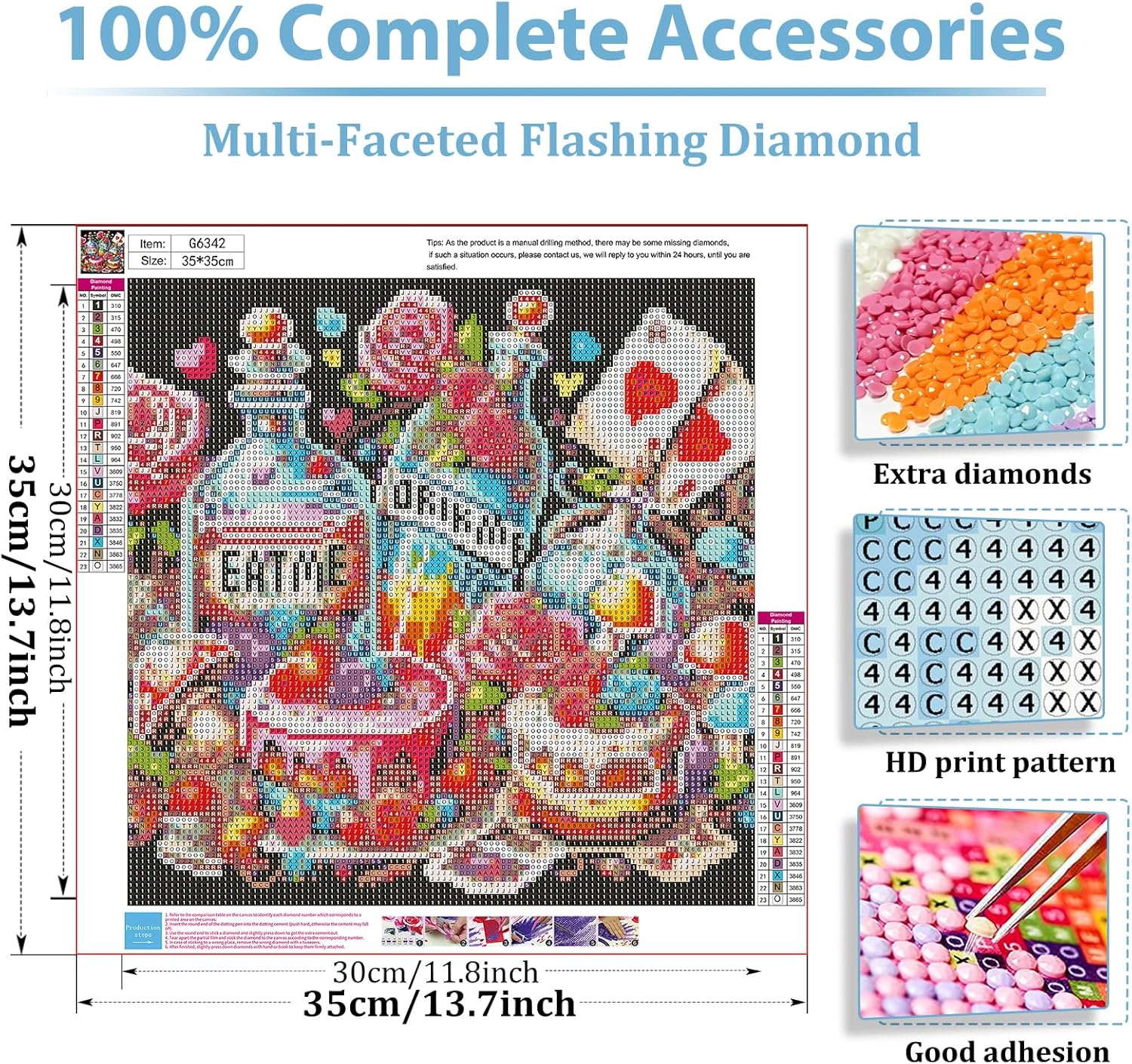Diamond Art Kits:Our upgraded diamond painting includes everything you need! Includes:1 canvas,1 pack of colored diamonds(add extra 30% beads),large tray,clay,30x diamond bags and 1 diamond pen with two replacement nibs
