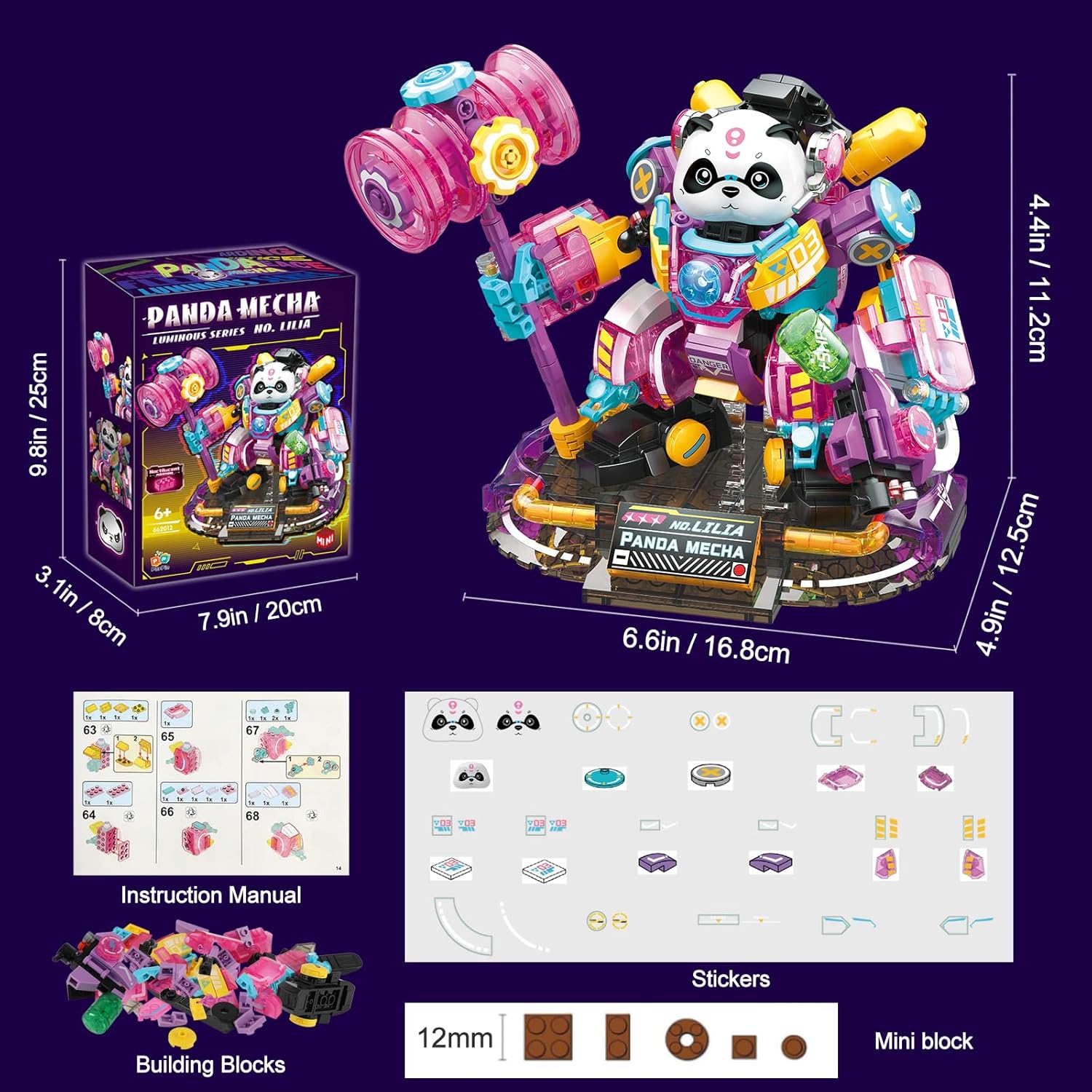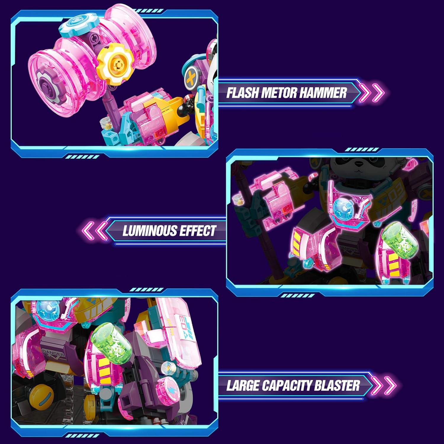 🐼 【Cute Panda Building Set】- This cute and brave mecha panda is made of 618pcs mini building blocks. It holds a flashing meteor hammer in its left hand and a blaster in its right hand, guarding the order of the city! Join the mecha panda team to fight for justice! Please noted that this is the MINI building blocks, which is not compatible with well-known brands.