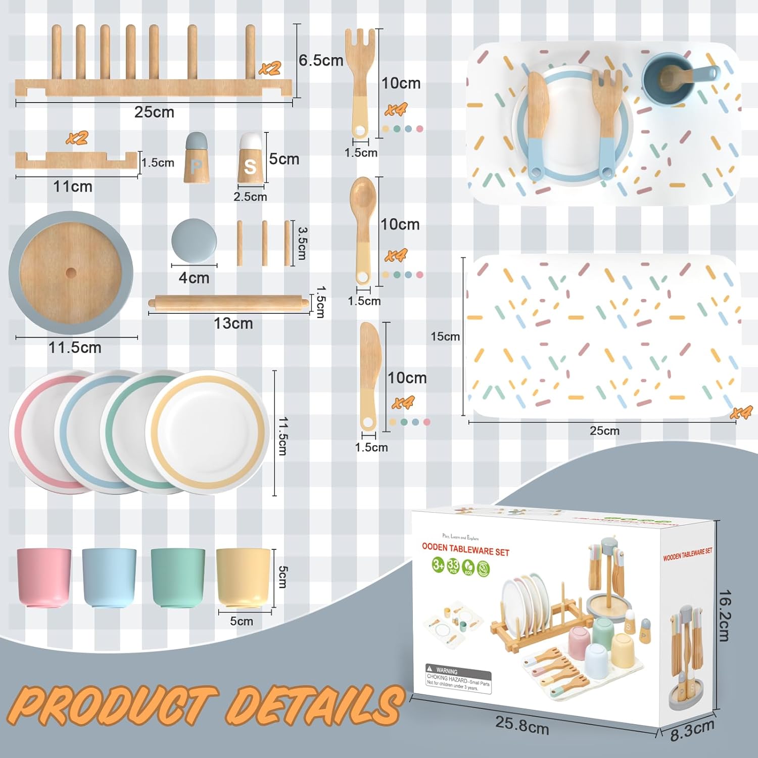 【33-piece kitchen toys for toddlers 1-3】This 33-piece kitchen appliances toys for kids role-play set contains four complete sets of tableware, including 4 plates, 4 cups, 4 knives, 4 forks, 4 spoons, 4 placemats, 2 condiment bottles, 1 plate stand, and 1 knife, fork, and spoon stand. Children can play interactive games of pretend dinner and host dinner parties together.