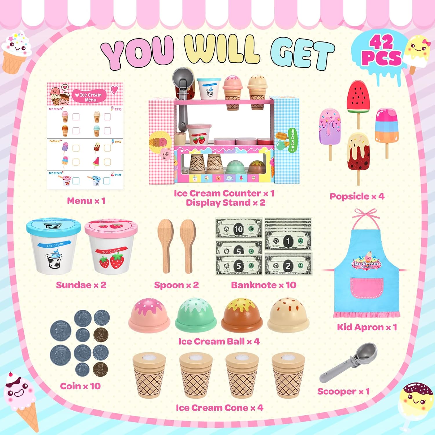 BEST VALUE PLAY ICE CREAM SET FOR KIDS GIRL TOYS BOY TOYS – INNOCHEER kids ice cream playset includes Cute Ice Cream Counter X 1, Ice Cream Ball × 4, Ice Cream Cone × 4, Popsicle X 4, Sundae X 2, Kid Apron X 1, Menu X 1, Charming Display Stand X 2, Ice Cream Scoop X 1, Spoon X 2, Coin X 10, Banknote X 10. Everything kids need to run their own ice cream shop! Our play ice cream set for kids includes different flavors of ice creams, popsicles, sundaes, and more, offering a delightful selection for your young ice cream shop manager. BEST VALUE Toddler girl boy toys.