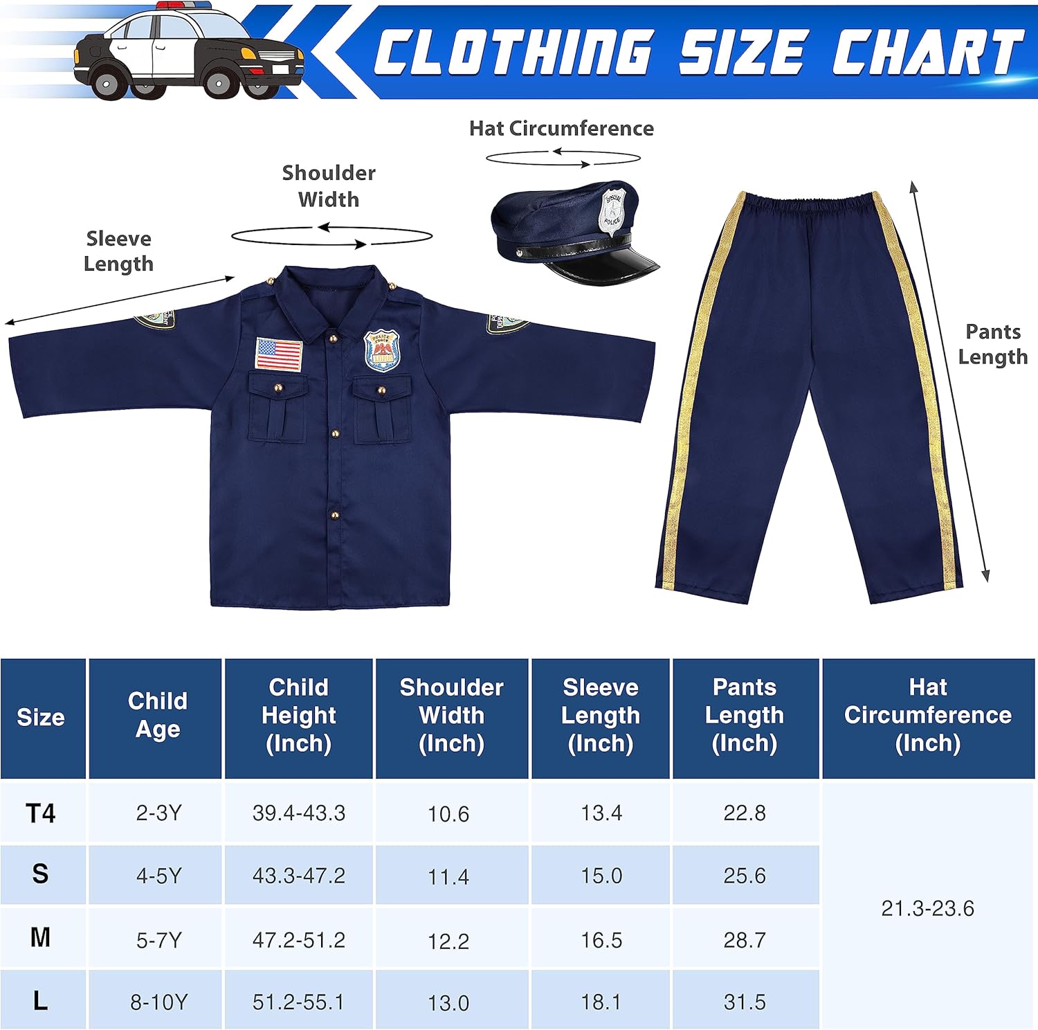 【Size & Note】The boys Halloween costume police set is available for 3-10 years old. T4 Size: recommend for kids ages 3. Small Size: recommend for kids ages 4-5. Medium Size: recommend for kids ages 5-7. Large Size: recommend for kids ages 8-10. Tips: To ensure your best-fit size, please check the size chart before ordering.
