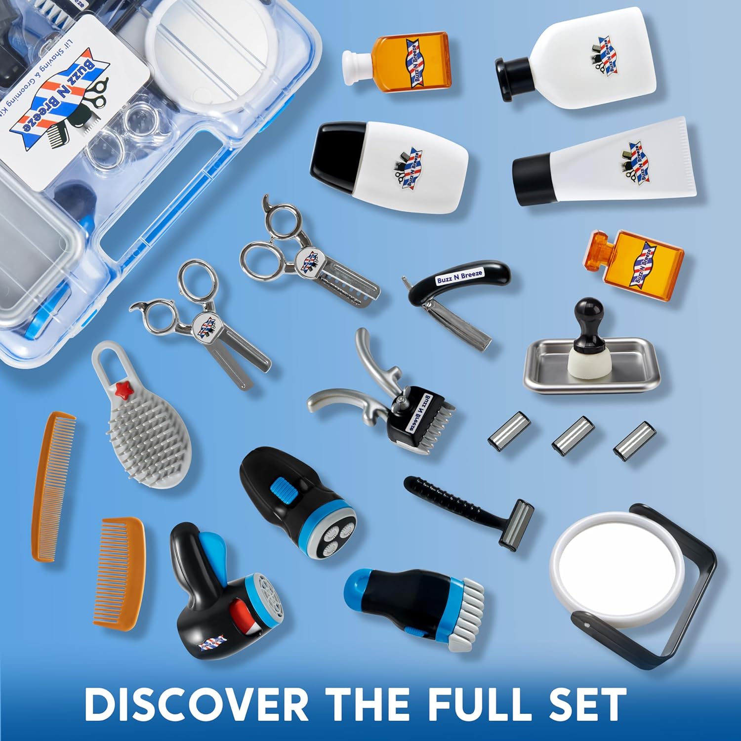 COMPREHENSIVE SET: Our pretend play set includes 23 Pcs barber shop pretend play kit for boys which includes a Shaver, Hair Trimmers, Scissors, Razors, a Hairdryer, a Mirror, a Comb, Bottles, a Cleaning Brush, and other boy salon styling accessories for your kid.