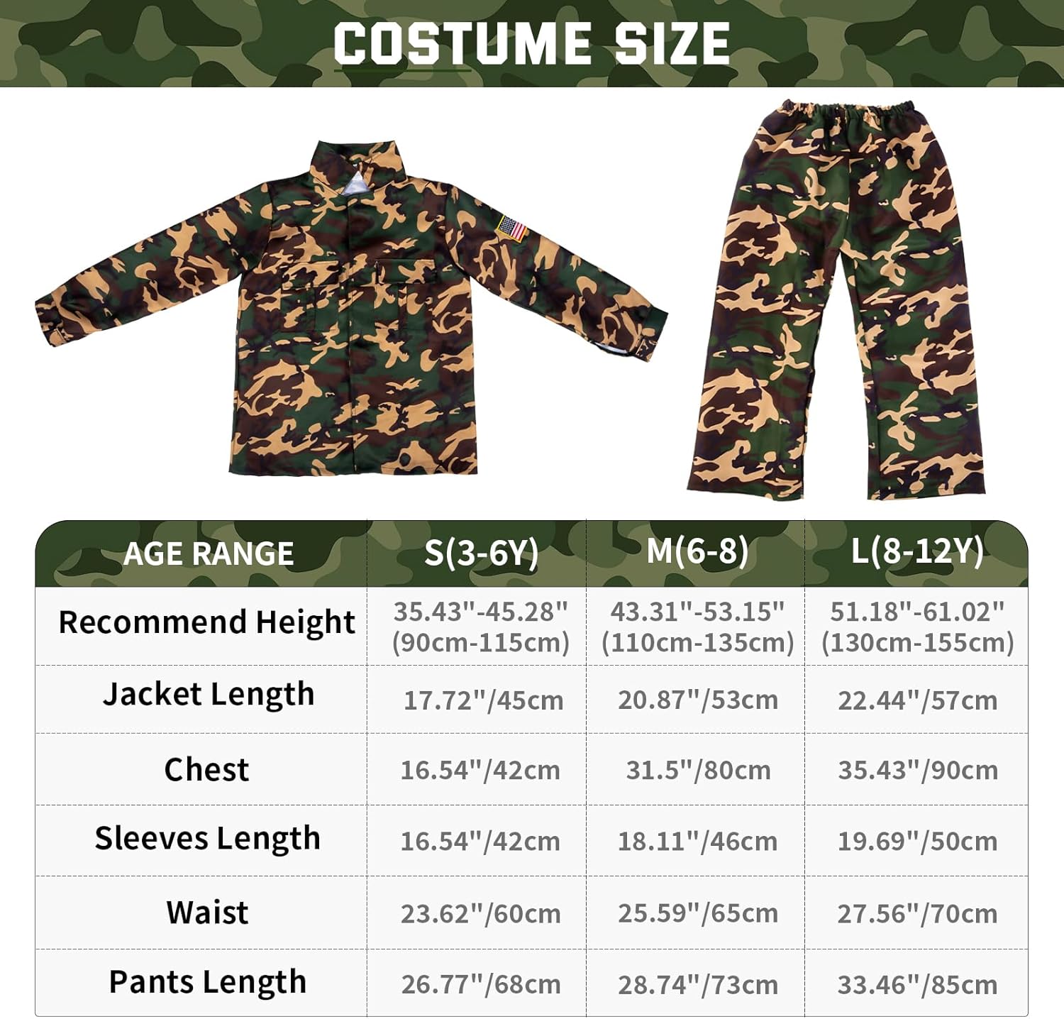 Medium Size Skill for Kids of 6 7 8: Our military uniform for boys birthday gifts has 3 sizes to suit most kids toy boy 8-10 years old. The medium size(6-8 yrs) with Jacket Length(20.87”) and Pants Length(28.74”). Boy pretend play toy for pretend lover