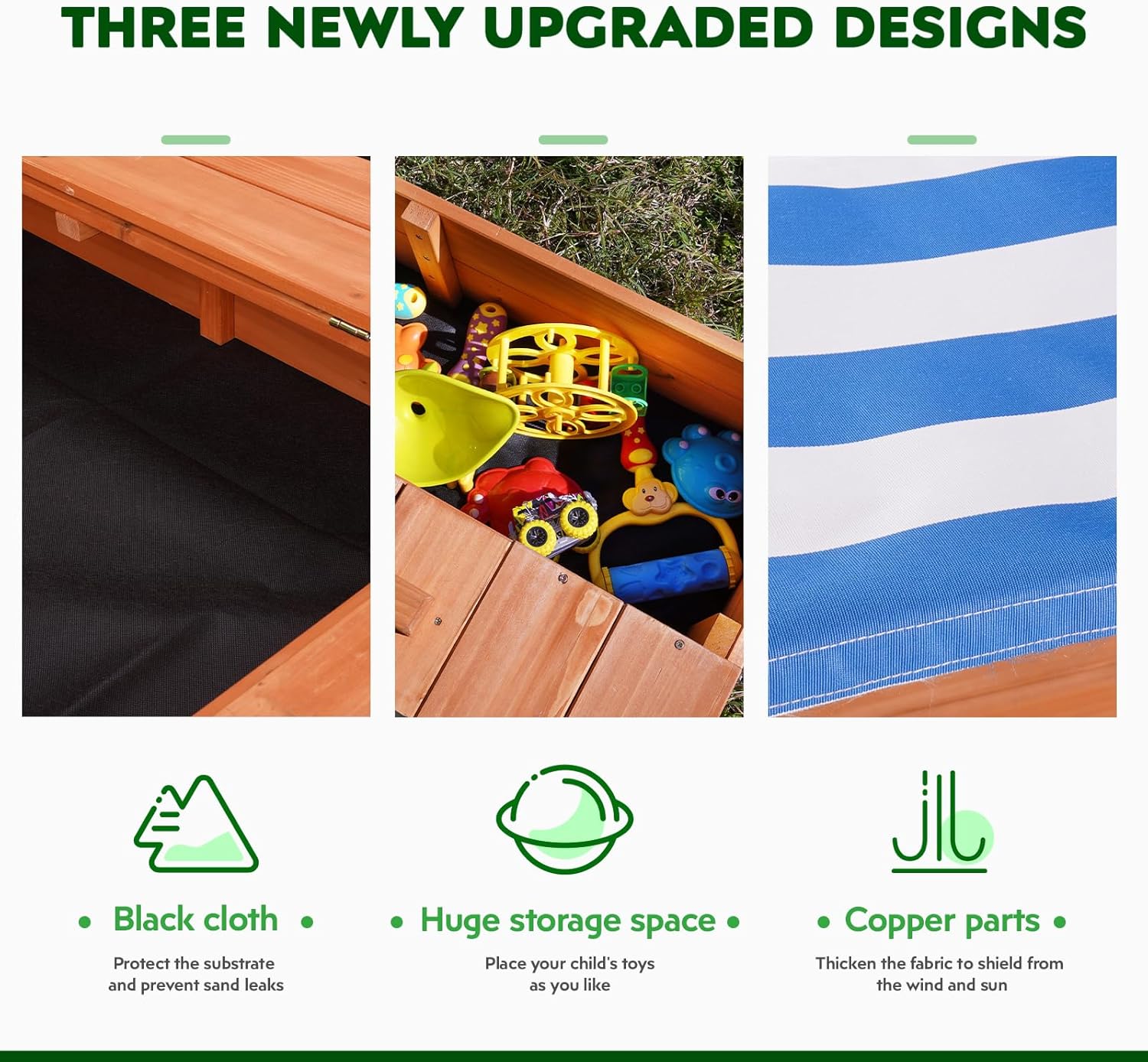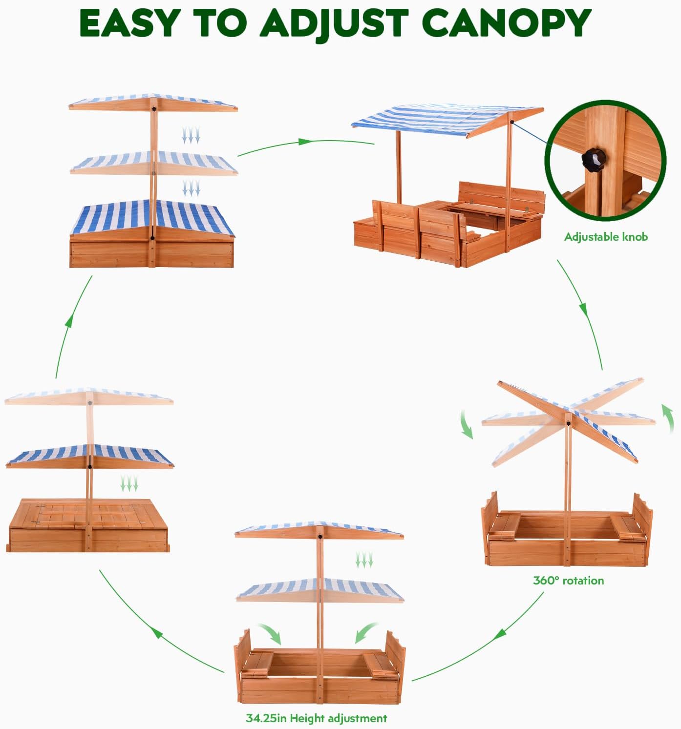Sandbox with Cover:With a weather-resistant canopy,Feel free to adjust the height of the canopy you want according to the position of the sun allow your children to play outside with protection from the hot summer sun or rain. The benches easily fold down into a split cover to keep the sand clear of debris.