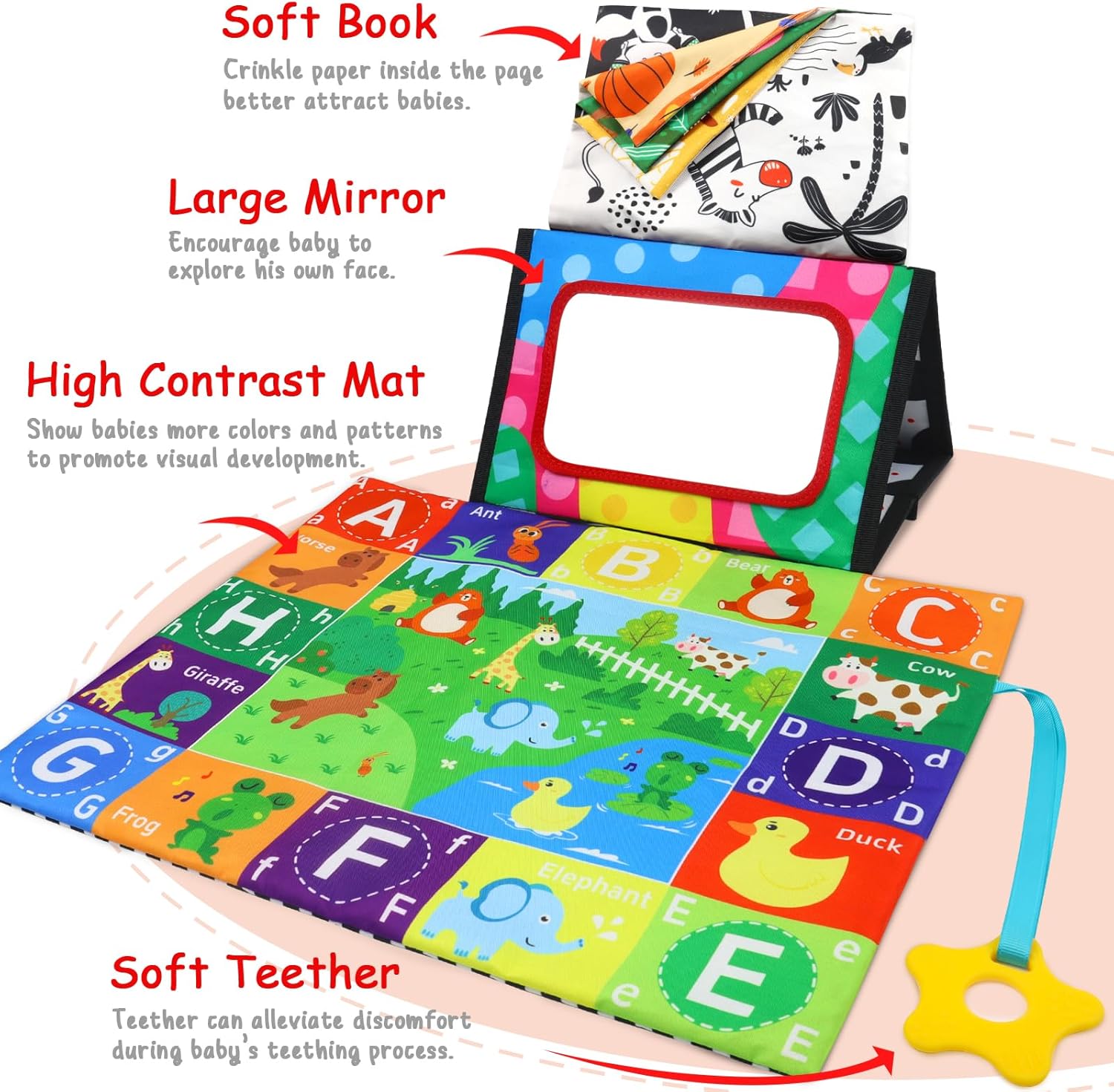 【WITH REMOVABLE CRINKLE TOYS】The back of the tummy time toys has a patchwork fabric with letters and numbers printed on it. It looks nice but also gives kids something to learn from as they grow up.