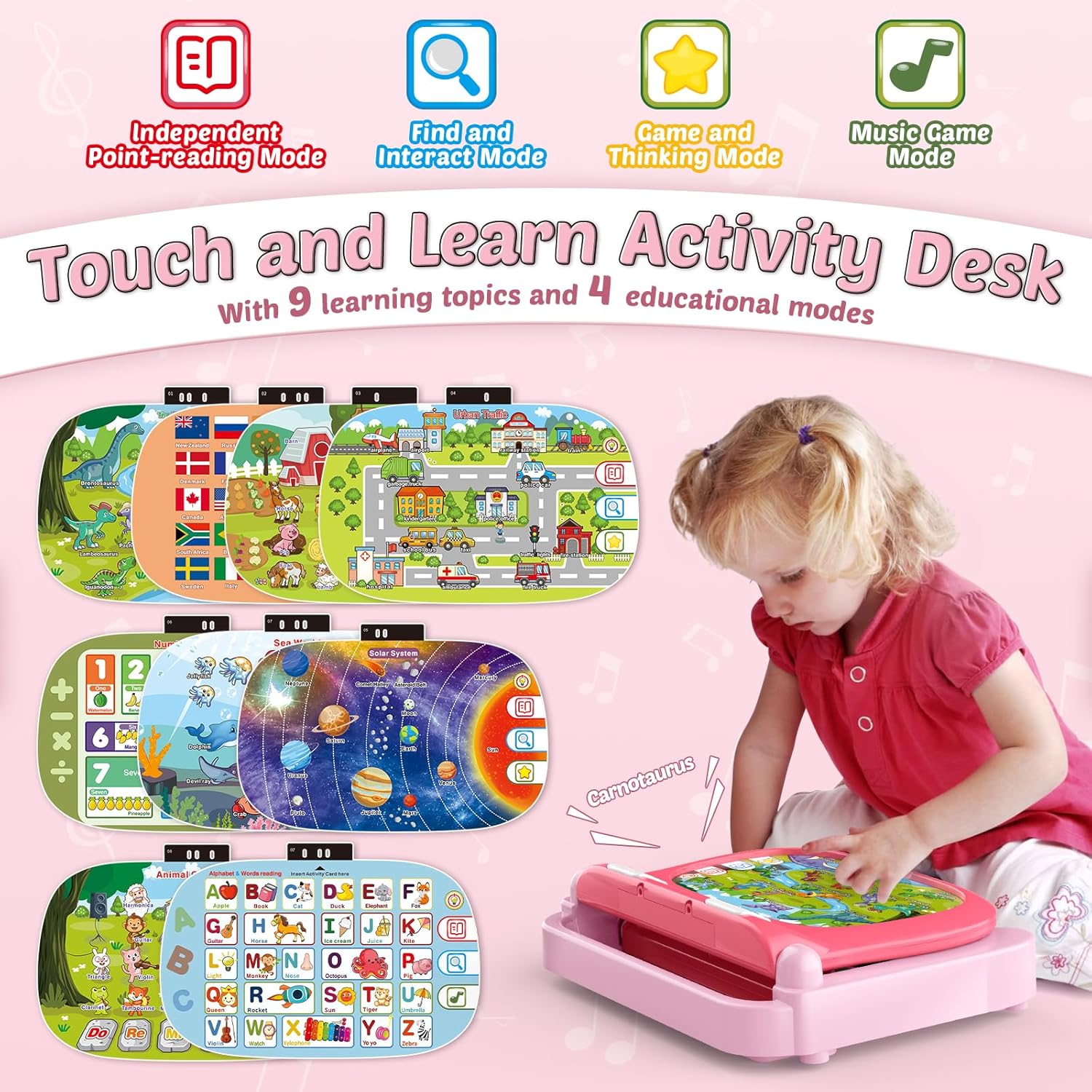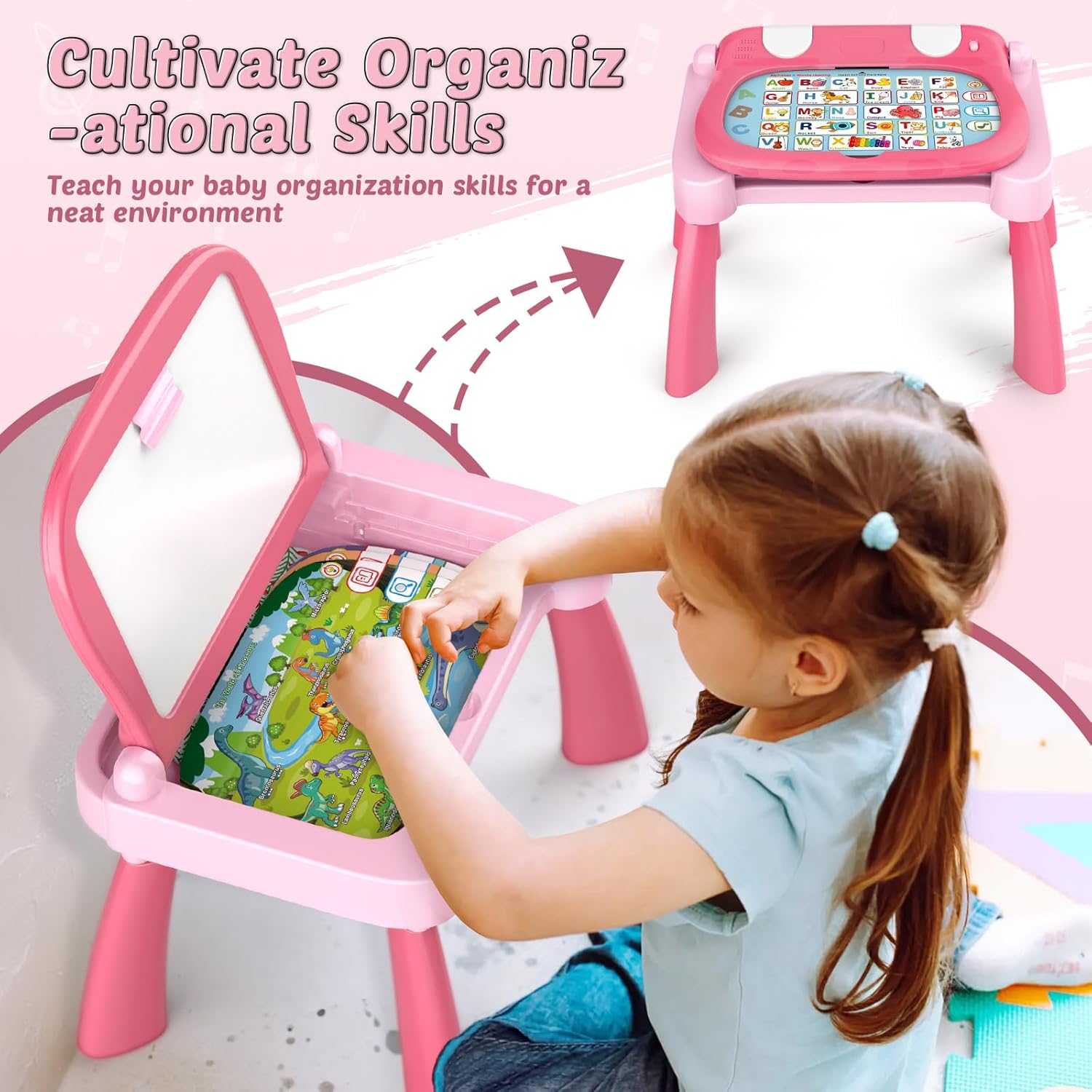 The toddler activity table features an interactive surface with 9 double-sided cards, covering topics like traffic, numbers, letters, animals and more. With 4 learning modes per card, kids can engage in fun, independent learning when you are busy