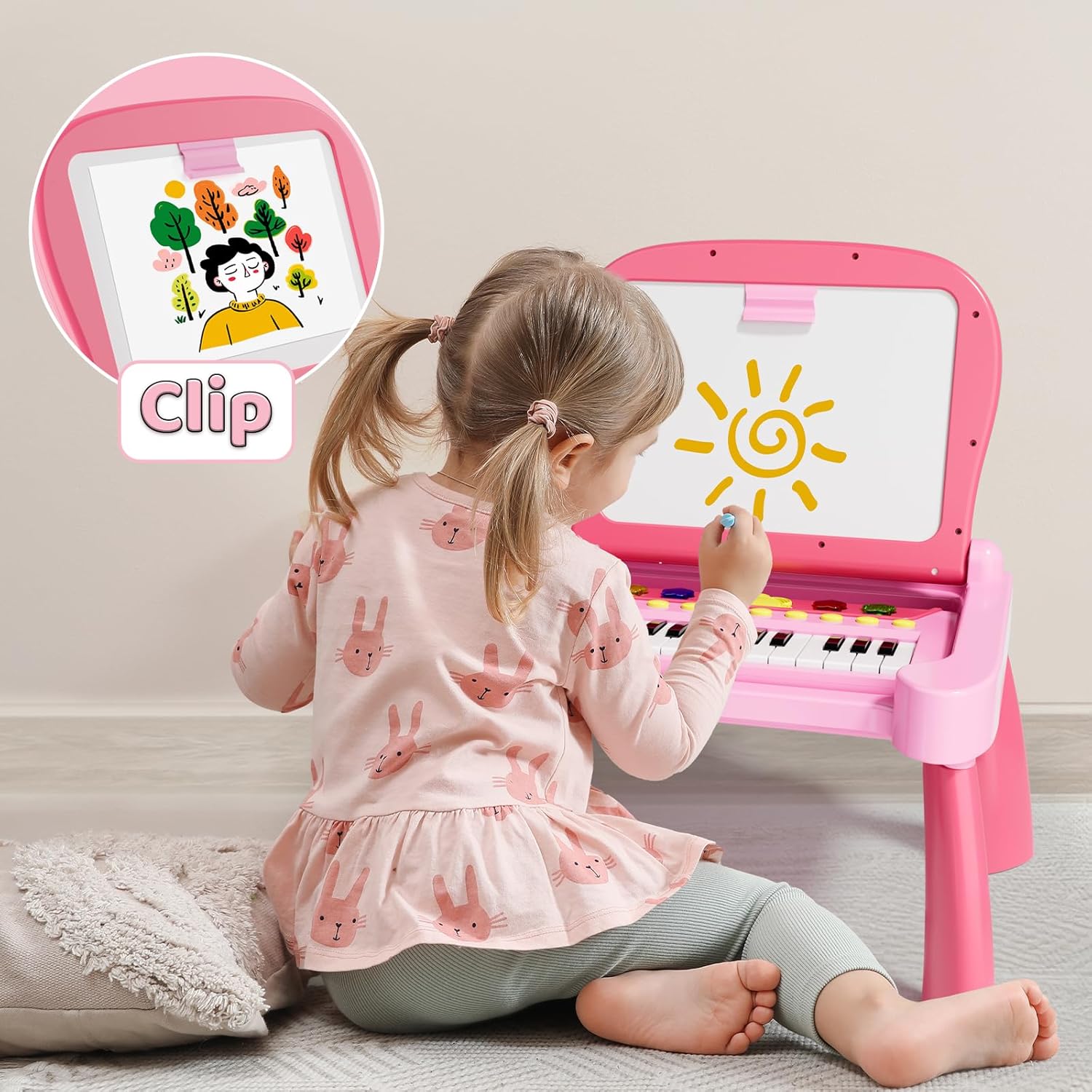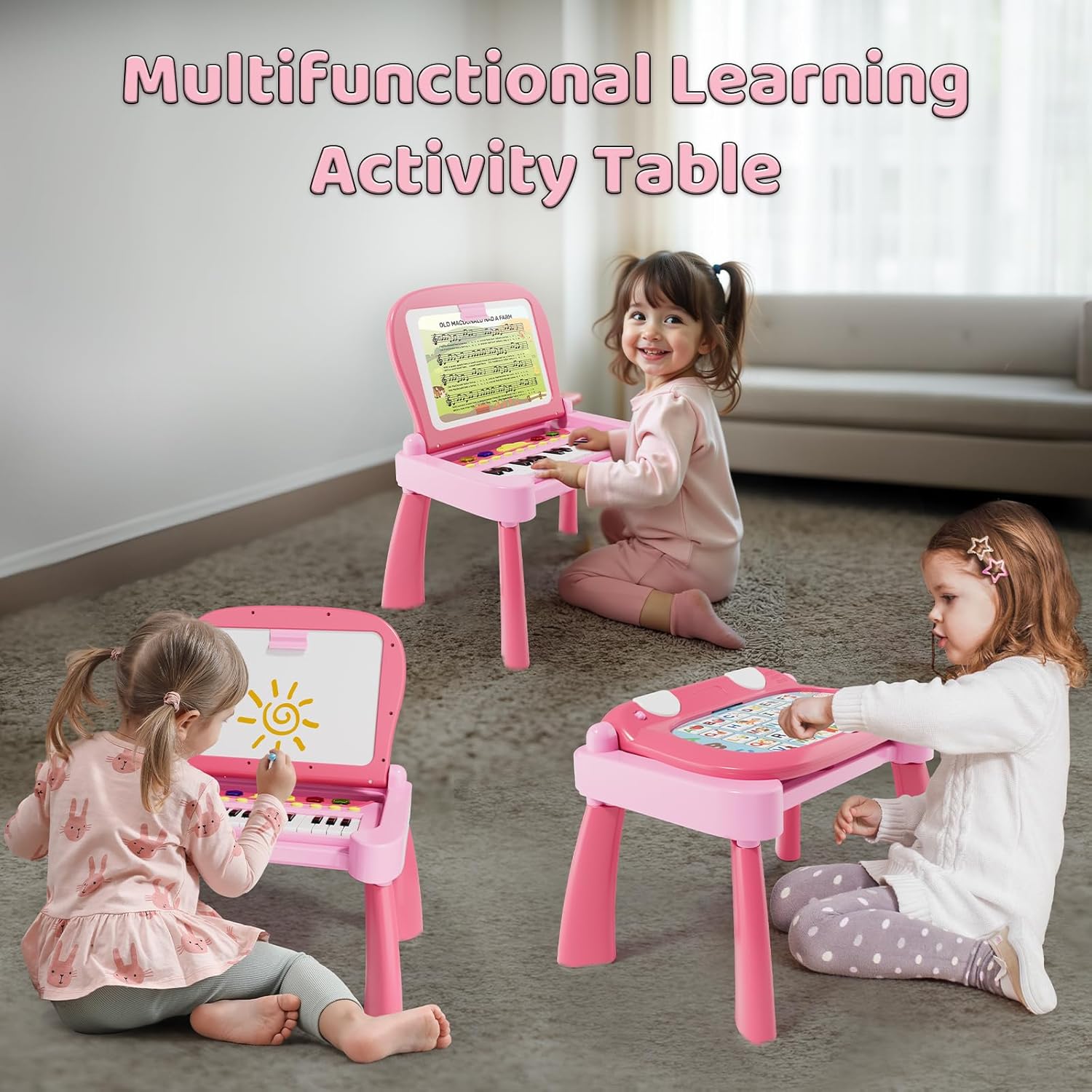 The multifunctional musical toys features a wipeable drawing board on the back for writing and drawing. With detachable legs, it transforms from a floor toy to a standing music table, perfect for helping babies learn to walk