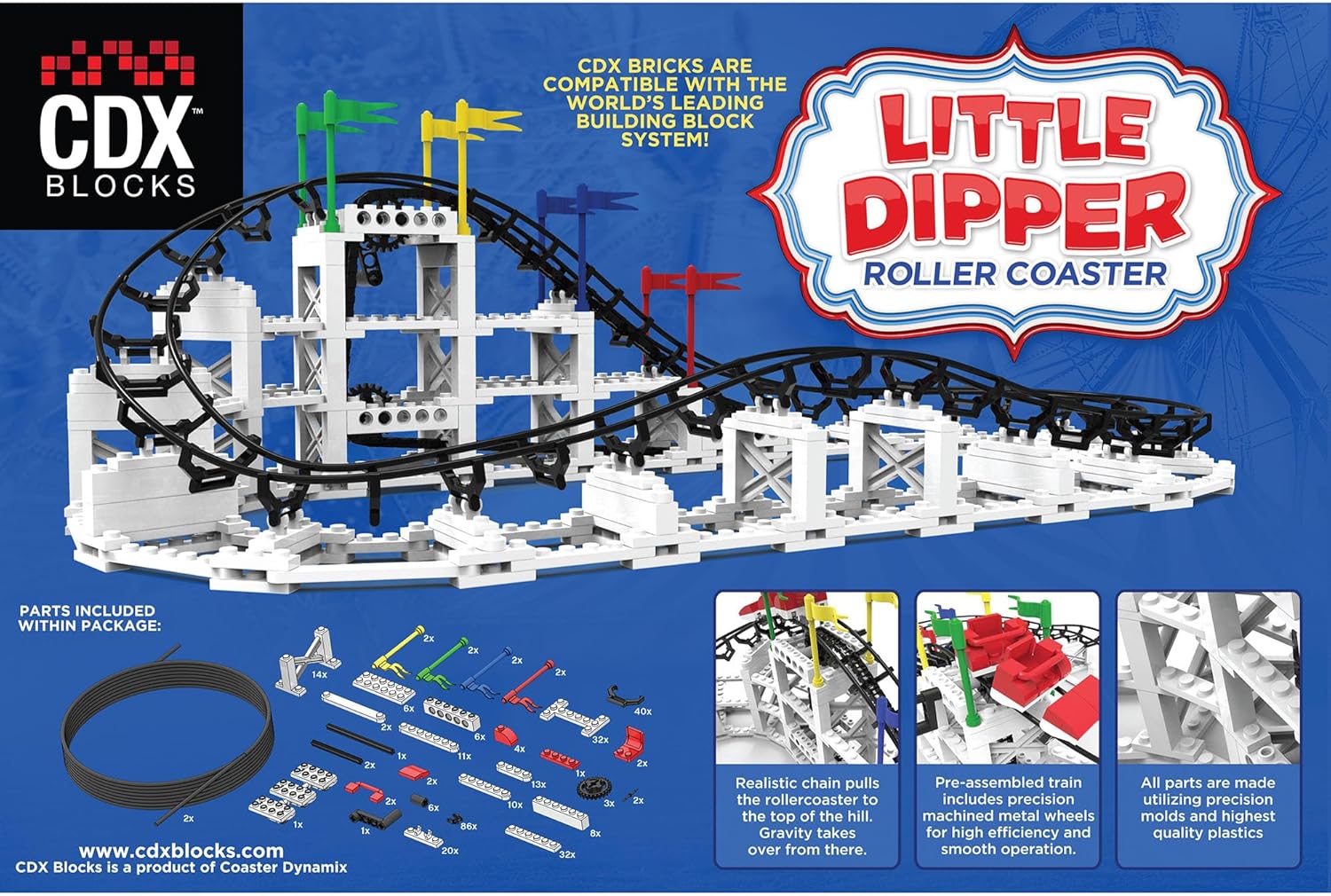 BUILD YOUR OWN ROLLER COASTER: Using a combination of custom designed block parts along with standard block components, the Little Dipper from CDX Blocks is engineered for quick assembly and realistic operation via gravity.