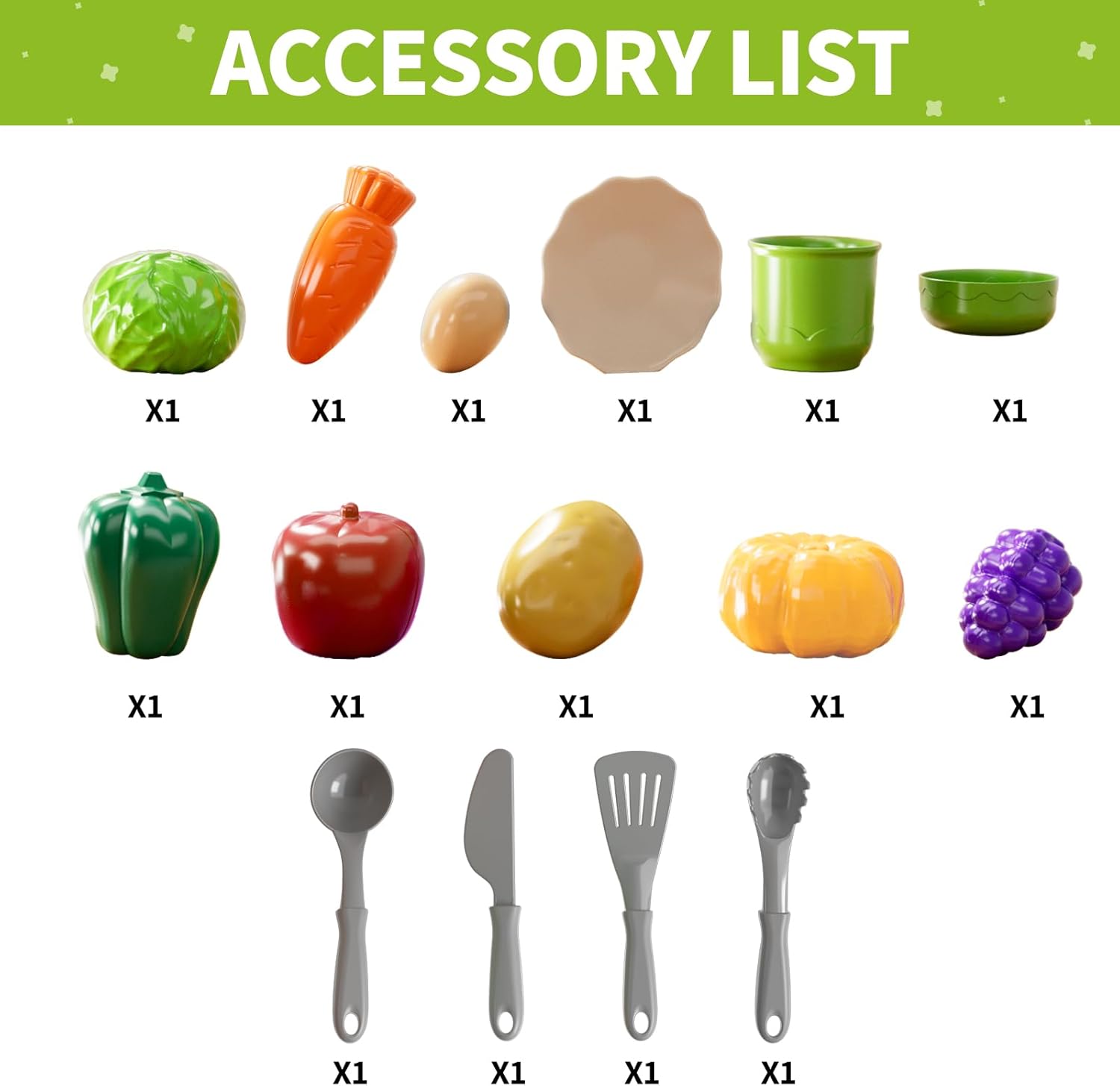 【Deluxe Kids Kitchen Playset】There are 18PCS of play kitchen sink toys, including 1* kitchen sink, 1*faucet, dish rack*1, 4* spoons or forks, 1* plate, 1* cup, 1*bowl, 7*Fruits or vegetables, etc., which can help boys girls better understand kitchen supplies and learn some kitchen knowledge to accompany age 1-4 boys girls to grow up better.