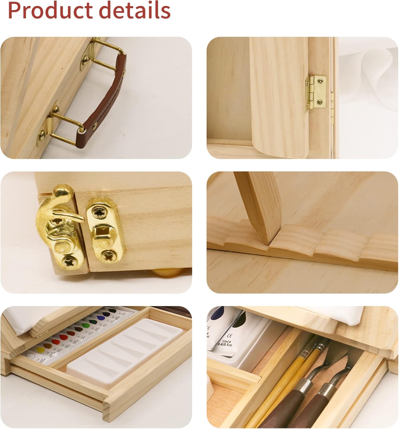 Equipped with a drawer with three compartments, it can keep your brushes, paints & other art supplies well-organized.Portable paint tool storage box with a top handle for ease of carryingThe sturdy tabletop artist easel with two locking clasps keep supplies secureSafe and Non-Toxic: It has passed quality inspection and can be used with confidence