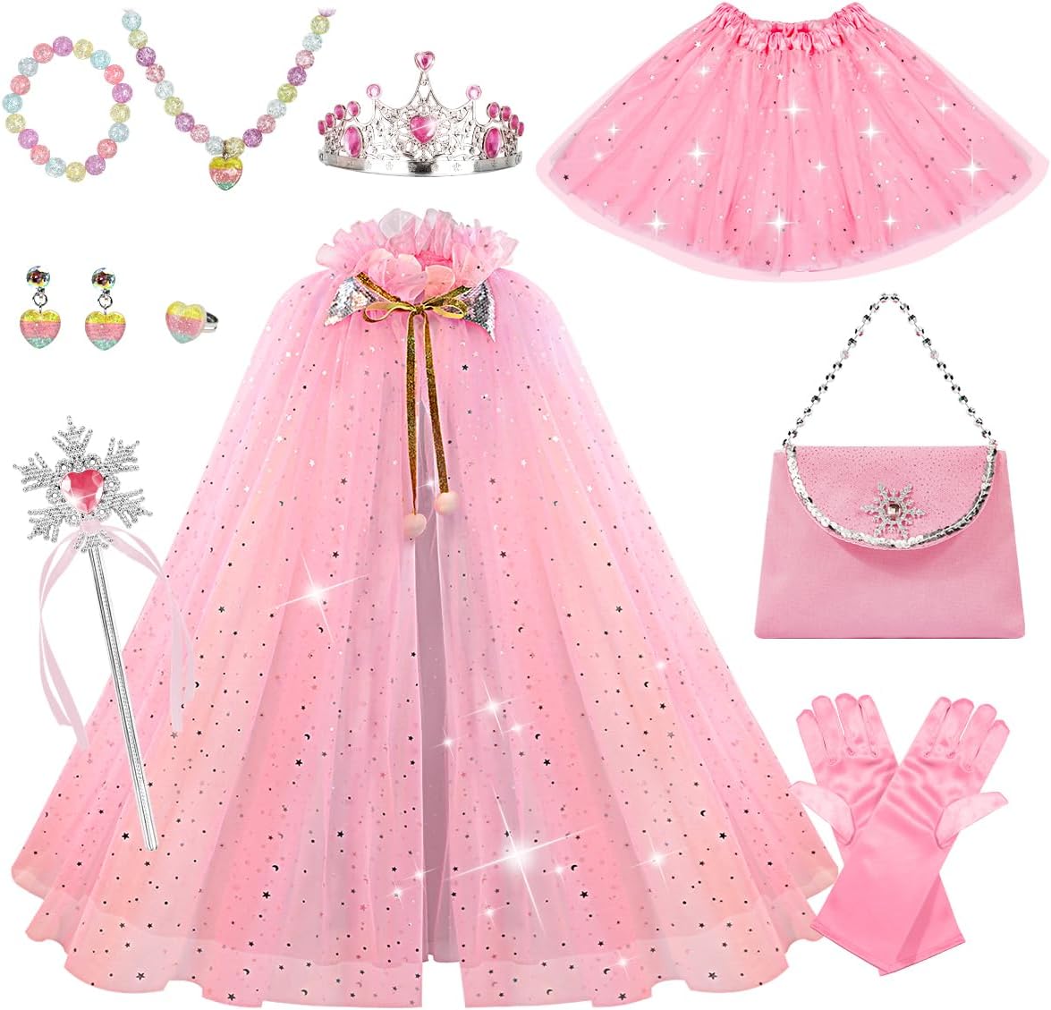 A Trendy Toddler Princess Dress Up Costume to Achieve Girl’s Princess Dream & Complete Her Princess Dresses. Why Choose Meland Princess Costume for Girls: – Glittering capes for kids. Sparkle sequins cover the kids cape, we believe little girl will immediately fall in love with this girl toys. – Rich princess accessories. All accessories are made of premium material with sturdy construction and rounded edges, kid-friendly to wear. Your little princess will be shining and exuding princess vibe with Meland princess costume for girls! – Well design in every detail. The toddler cape is made of soft and skin-friendly fabric, and the shoulder straps are carefully designed to be worn comfortably by girls. – Gifts for girls age 3 4 5 6 7 8 years old. This princess toys is perfect for princess dress for girls, make her be the most noticeable princess. Package Including: 1*Princess cape 1*Play purse 1*Crown 2*Ear clip 1*Princess ring 1*Necklace 1*Bracelet 2*Glove 1*Princess wand