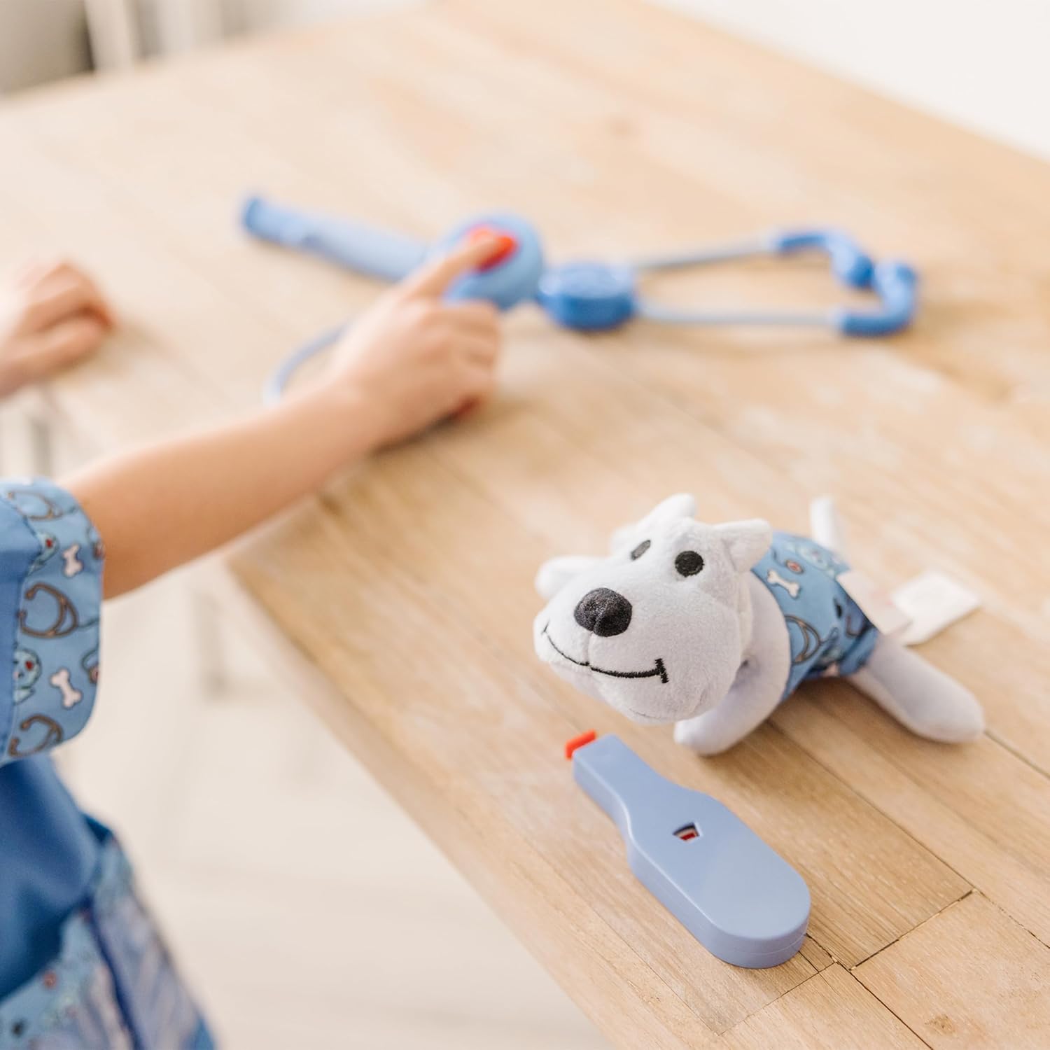 ENTERTAINING VETERINARIAN ROLE-PLAY COSTUME: This costume set is a dress-up and play set that includes a jacket, mask, cap, thermometer, stethoscope with sound effects, bandage, syringe, plush dog, and reusable name tag.