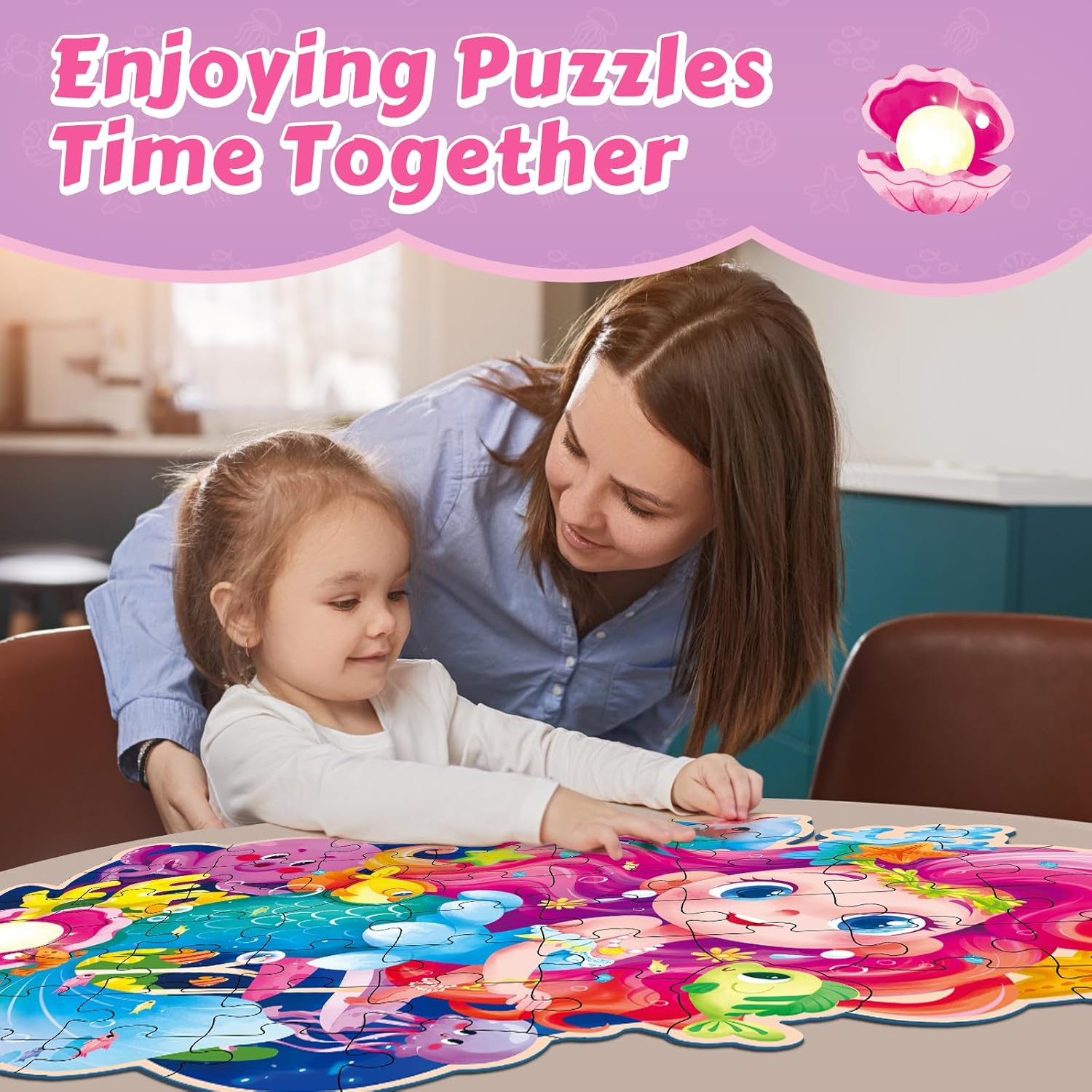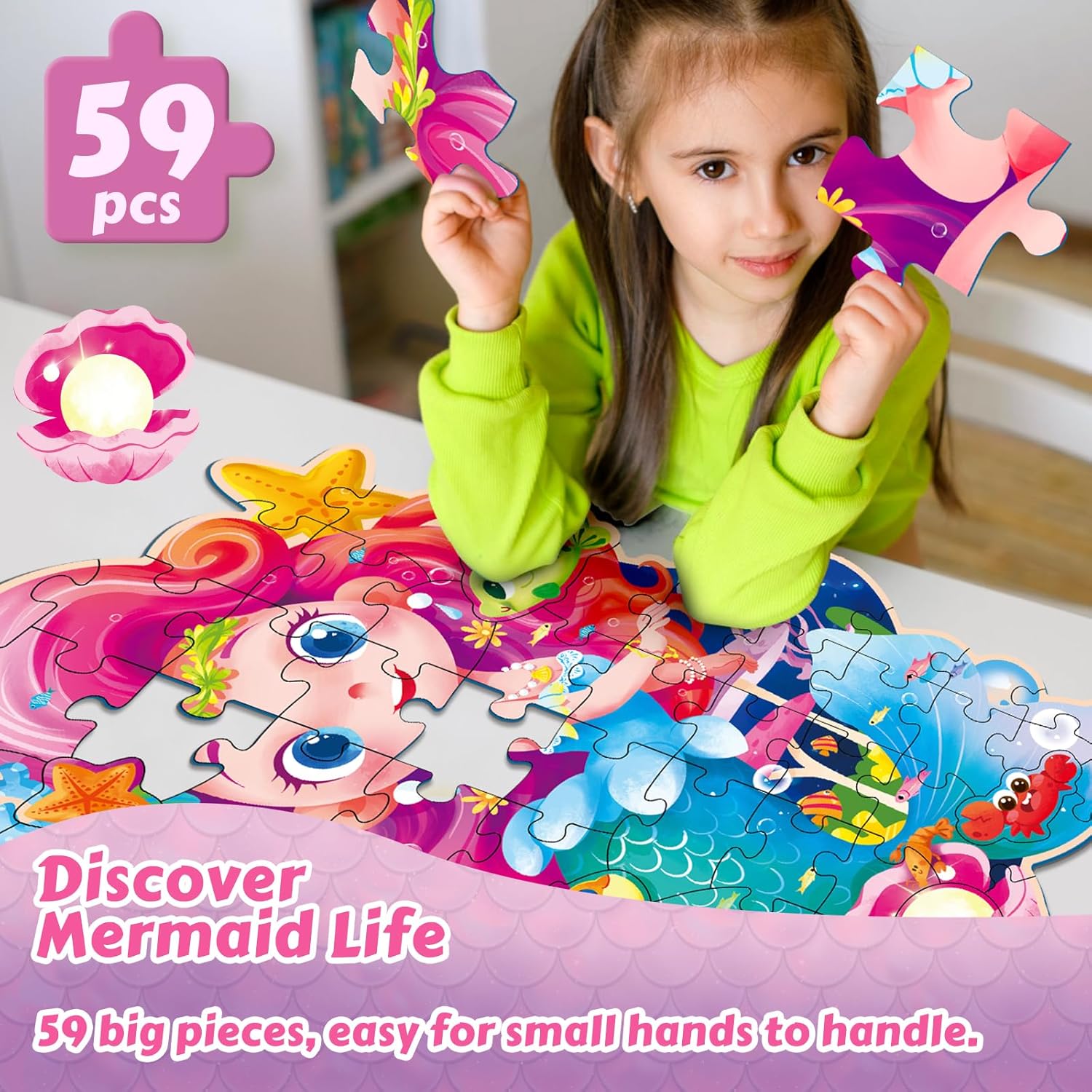 【Enchanting Mermaid Theme】Dive into a magical underwater adventure with this beautifully illustrated 59-piece Mermaid Floor Puzzle! Featuring vibrant mermaid and ocean scenes, it’s perfect for girls ages 3-8, igniting their imagination while enhancing cognitive development, fine motor skills, and problem-solving abilities in a fun and interactive way