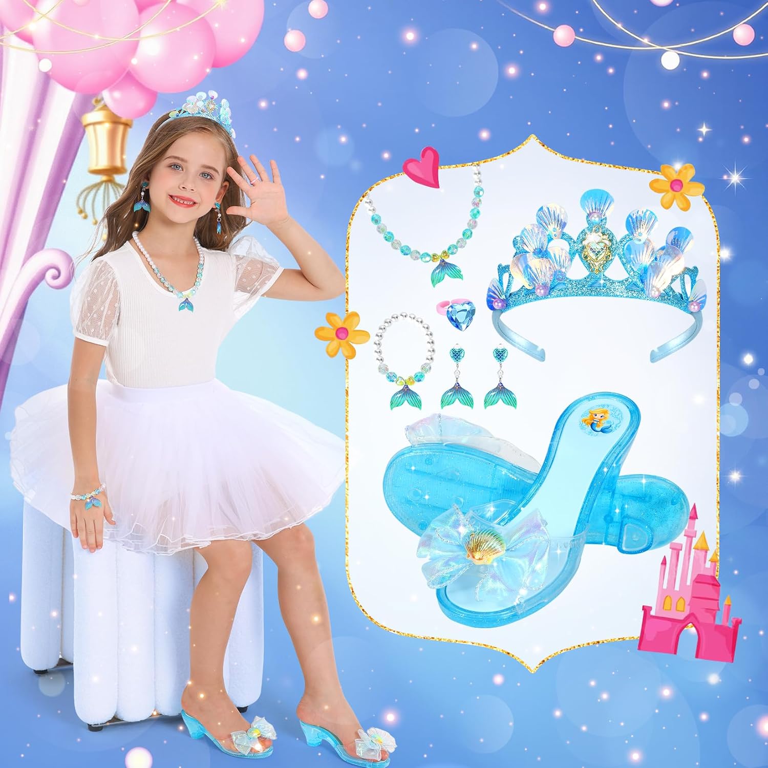 Luxury Mermaid Jewelry: Perfectly complement the mermaid high heels, all featuring enchanting mermaid elements, specially designed for little princesses. Each accessory is lightweight, comfortable, and made from safe materials, making it perfect for little girls to wear. Whether for everyday dress-up, birthday parties, or role-playing, this princess shoe set let that girls shine the brightest in any crowd.