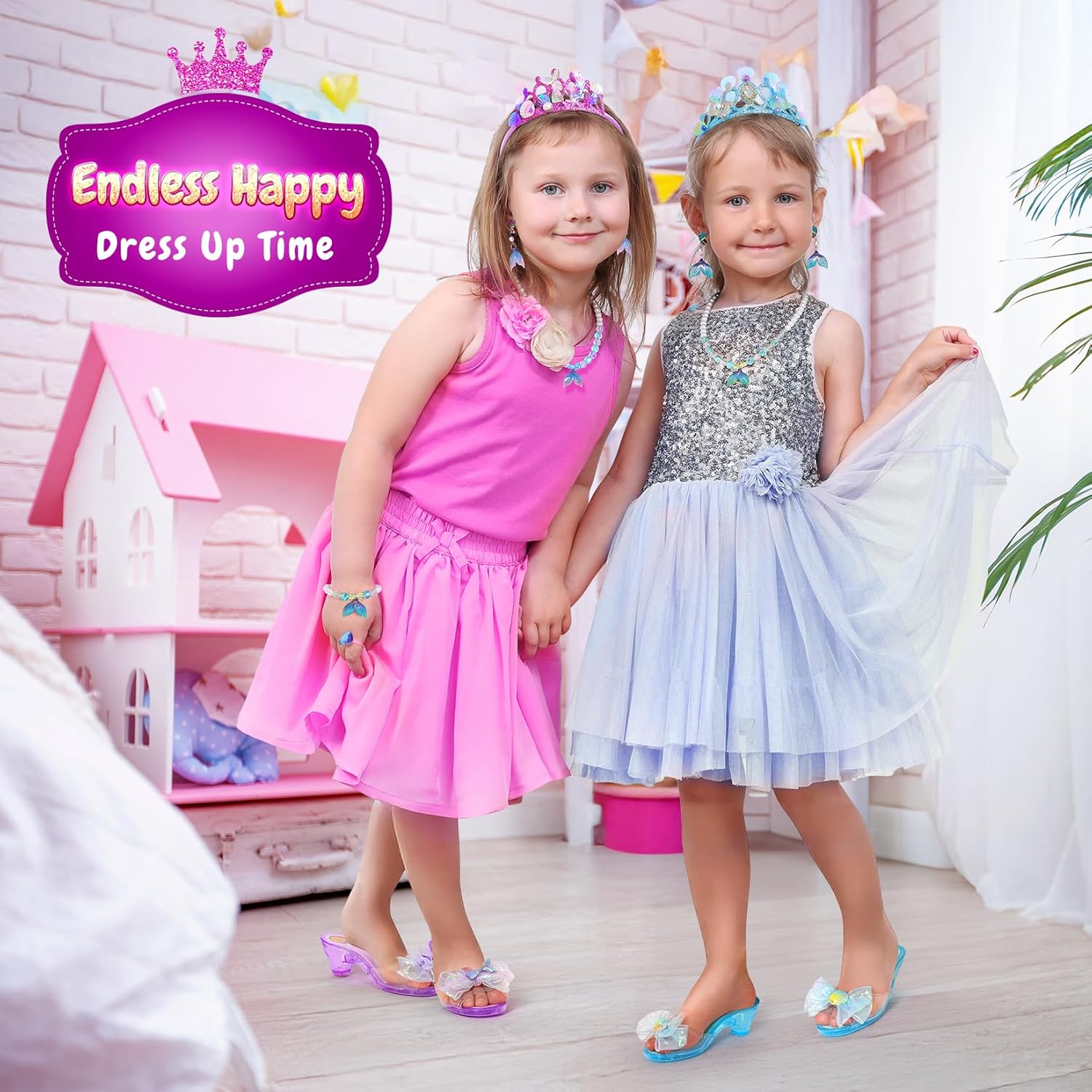 Mermaid Dress up Set: Step into fairy tale world with this enchanting dress up set! You will get 2 pairs of different colors mermaid high heels, 2 mermaid crown, 2 pair of earrings, 2 necklaces, 2 rings. All items are neatly stored in a charming storage box. This isn’t just a dress-up set; it’s every little princess’s dream collection!