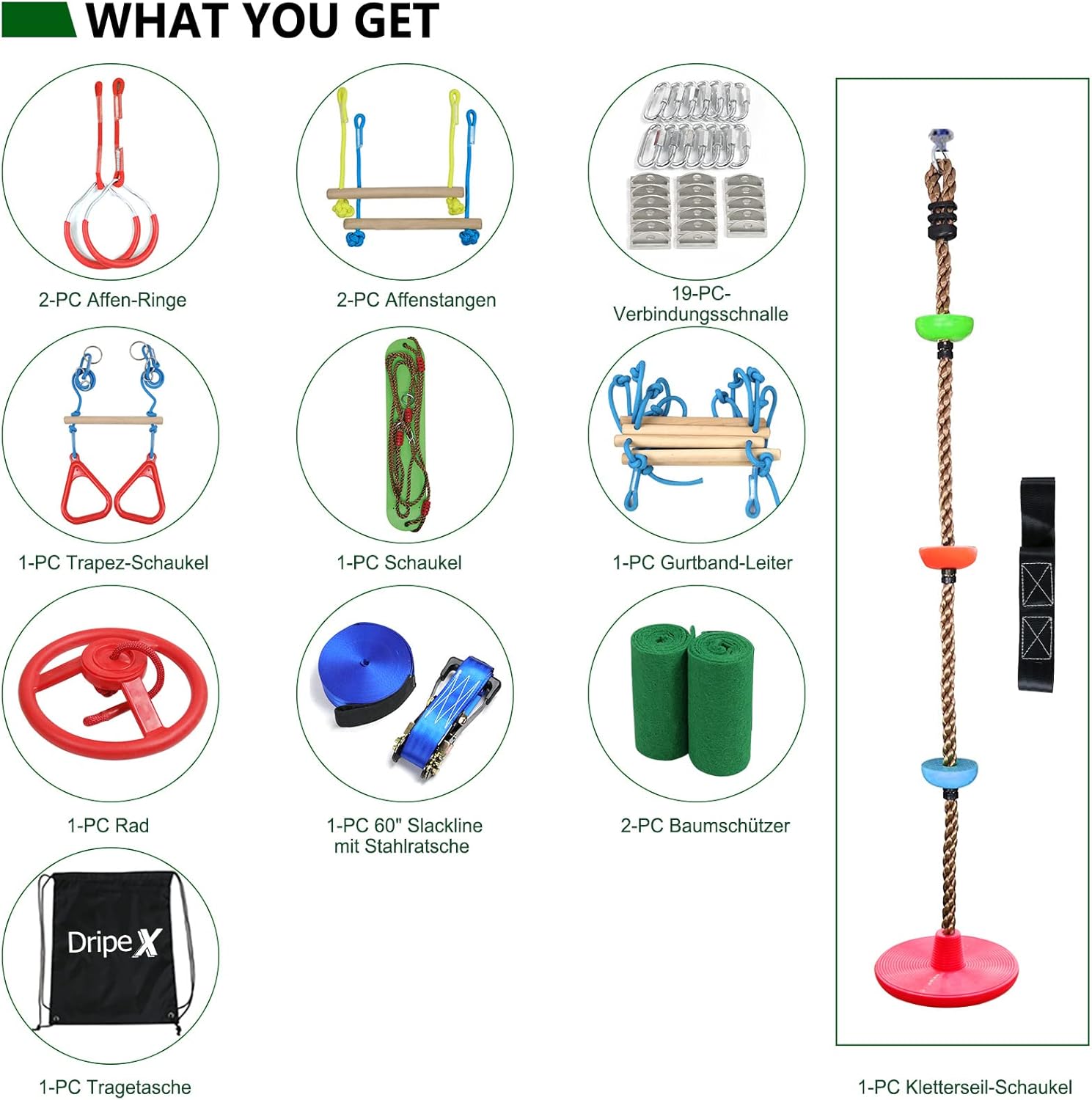 👍【Premium Quality】Dripex Monkey Line Obstacle Course is made of very durable slackline webbing and ratchet webbing, that can hold up to 400lbs. Our kit set include a 60ft slackline and 5ft ratchet line, 2 Monkey bar holds, 2 steel gym rings, 1 rope ladder, 1 free carry bag, 1 nylon rope knots, 1 swing, 1 climbing ladder, 19 hooks, 19 hanging buckles and 2 tree protectors. Our products have been tested by SGS, and you will feel completely relieved when using them.