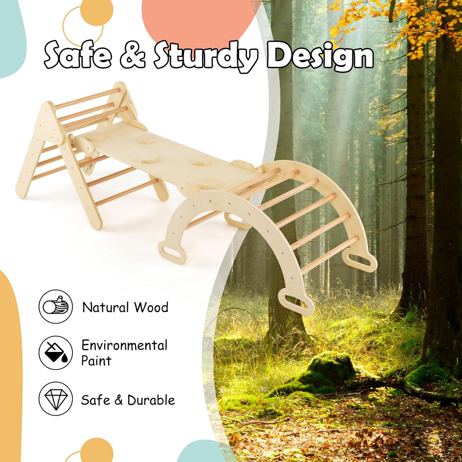 Stable Triangle Structure: The wood climbing gym is designed with triangle structure and reinforced screws, which offers stable support and is durable for long term use. It allows 2-4 toddlers to play together and the max weight capacity is 220lbs in total.