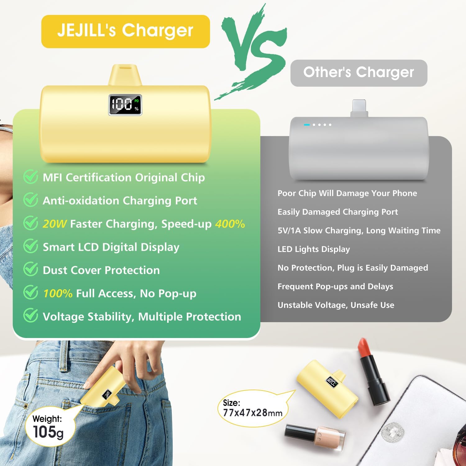 The mini portable charger adopts MFI certified chip, which means that compared with other ordinary power bank, JEJILL has stronger protection for your cell phone battery.