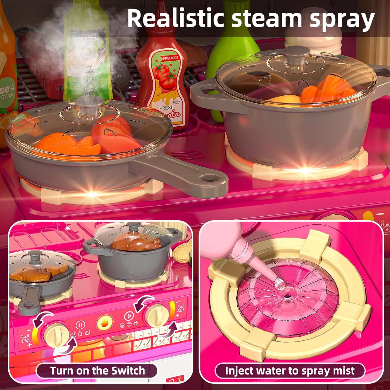 Electrical Play Sets: The kitchen toys features the function of spray and light. Turn on the knob, and let a little water onto the middle of the stove. After a few seconds, it will steam water-vapor, and light with sound of cooking food like cooking