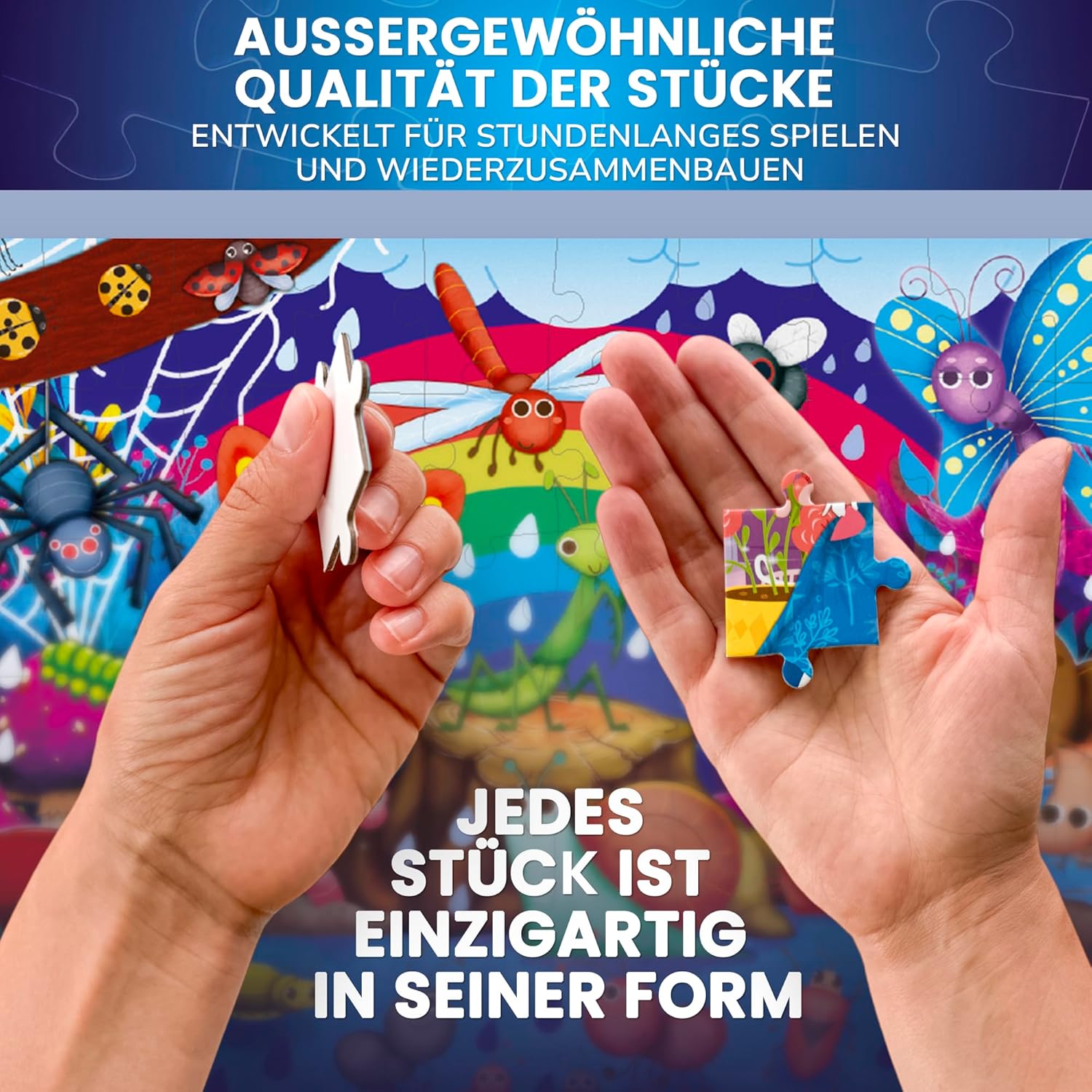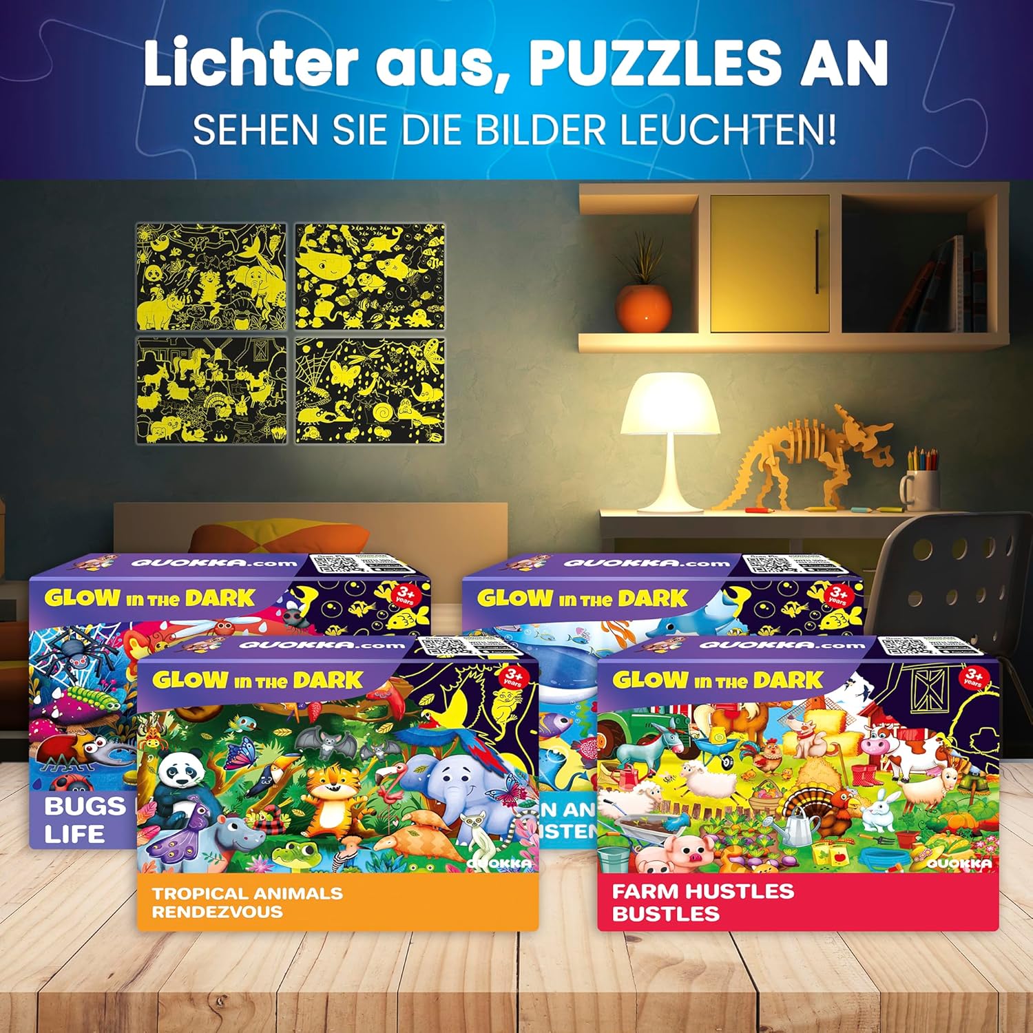 4 KIDS PUZZLES SET: our 60-piece puzzles for kids feature fun themes like Farm, Bugs, Tropical and Ocean Animals; Assemble beautiful illustrations with uniquely shaped, non-repeating pieces; Enjoy vibrant images by day and watch them glow at night
