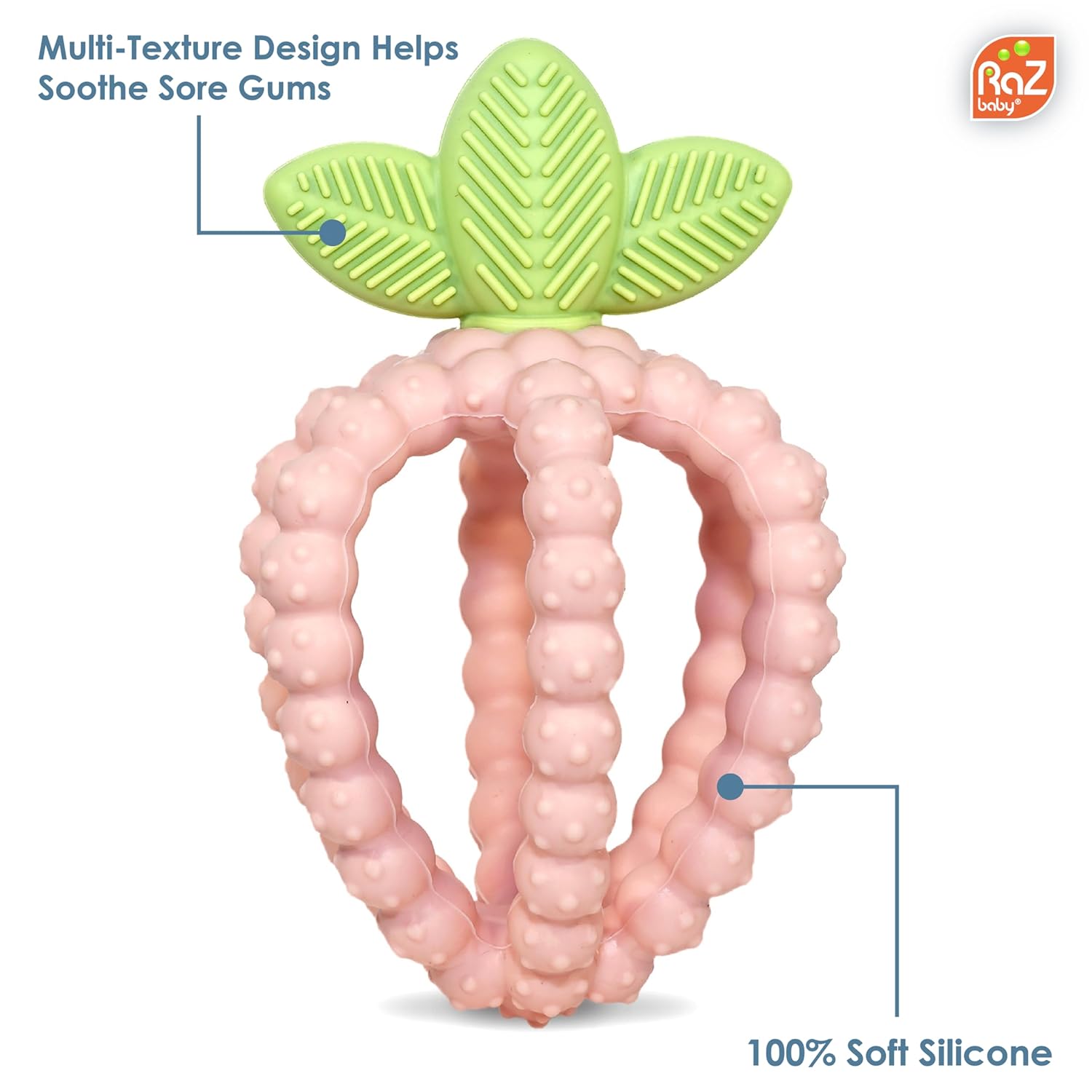 Multi-Texture: Our RaZberry teether for babies can be used with little hands to hold with perfectly sized, multi-textured handles. They are shaped like strawberries to help introduce real fruits, and designed for babies 3 months and up.