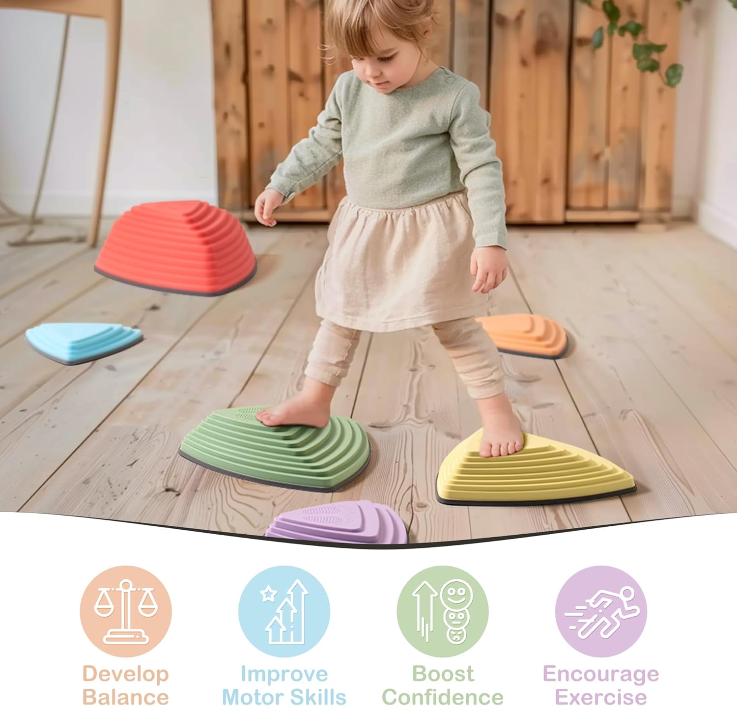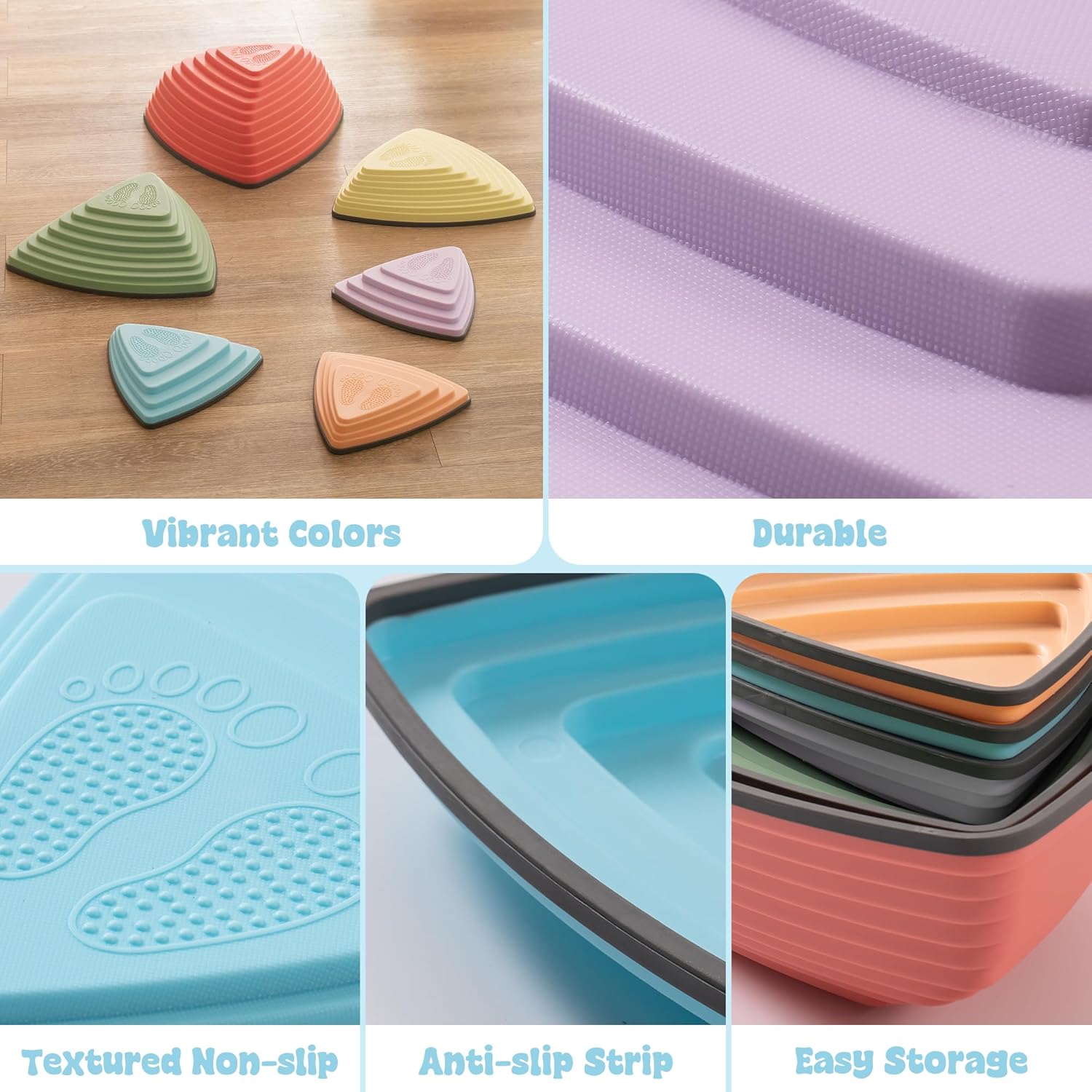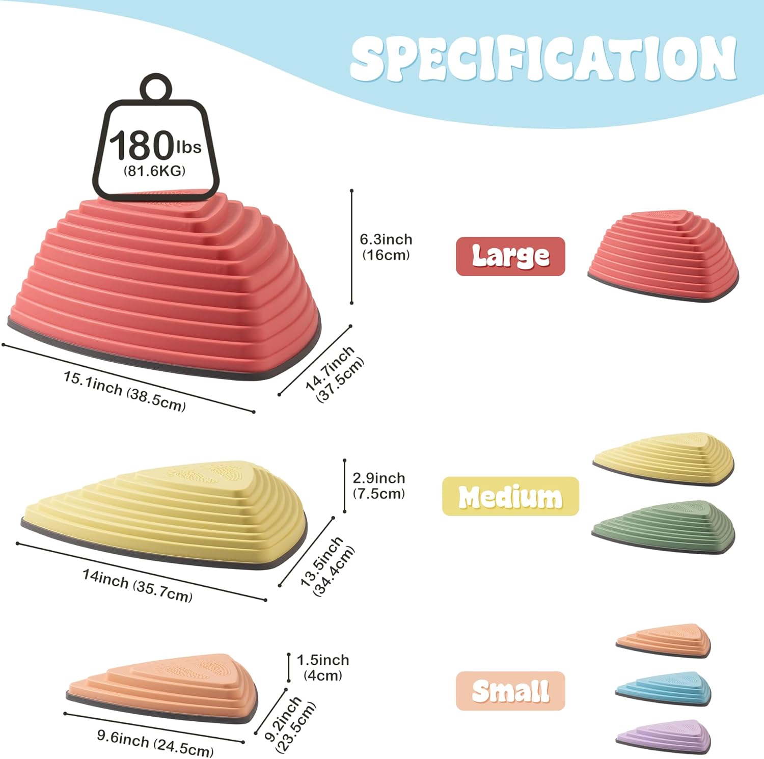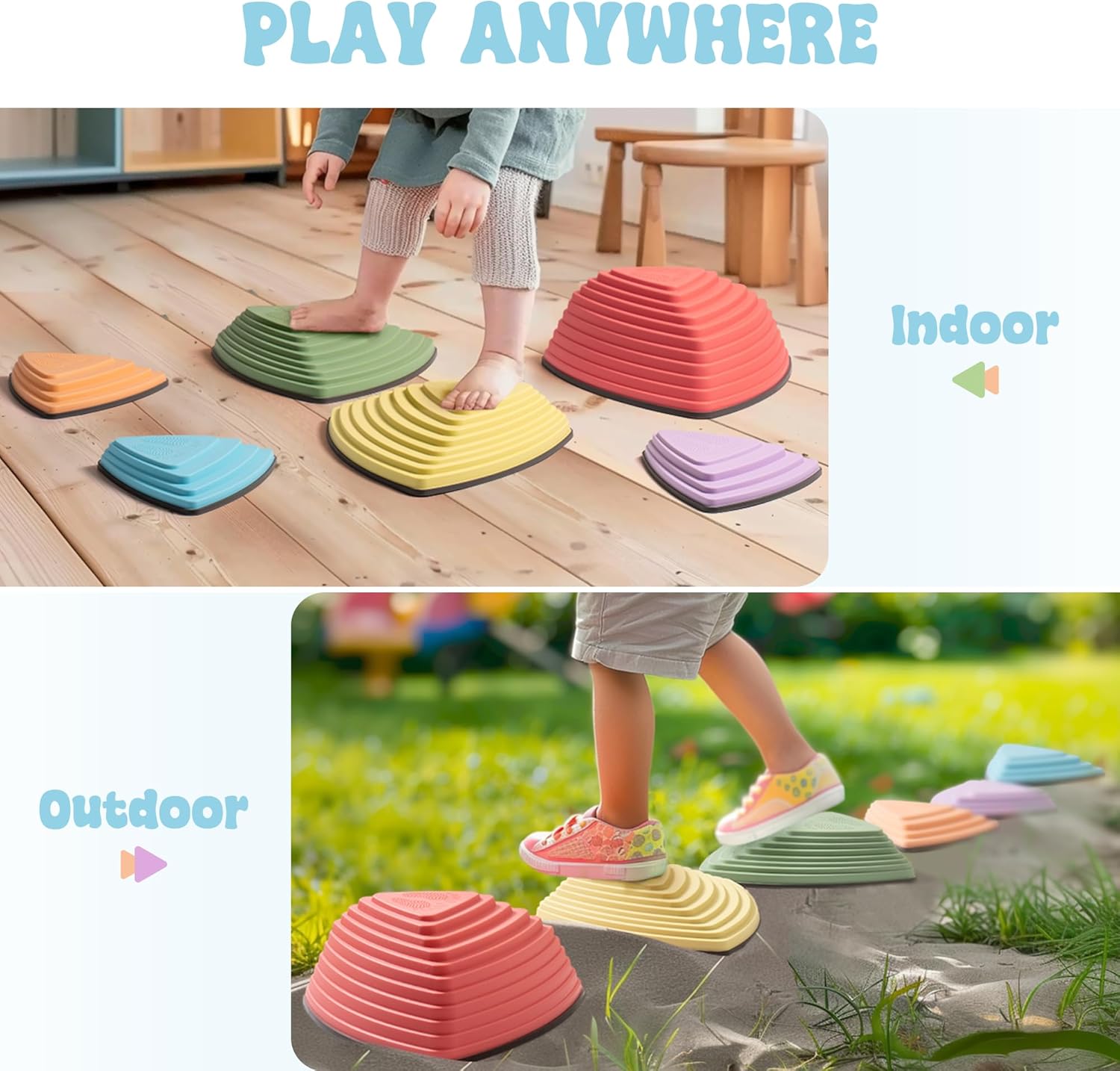 NON-SLIP DESIGN FOR SAFETY: Designed with rubber footings to prevent slipping, our stones ensure safe play on non-smooth surfaces like carpet or grass. Their sturdy triangular design offers stability, minimizing the risk of toppling over as kids hop and play.