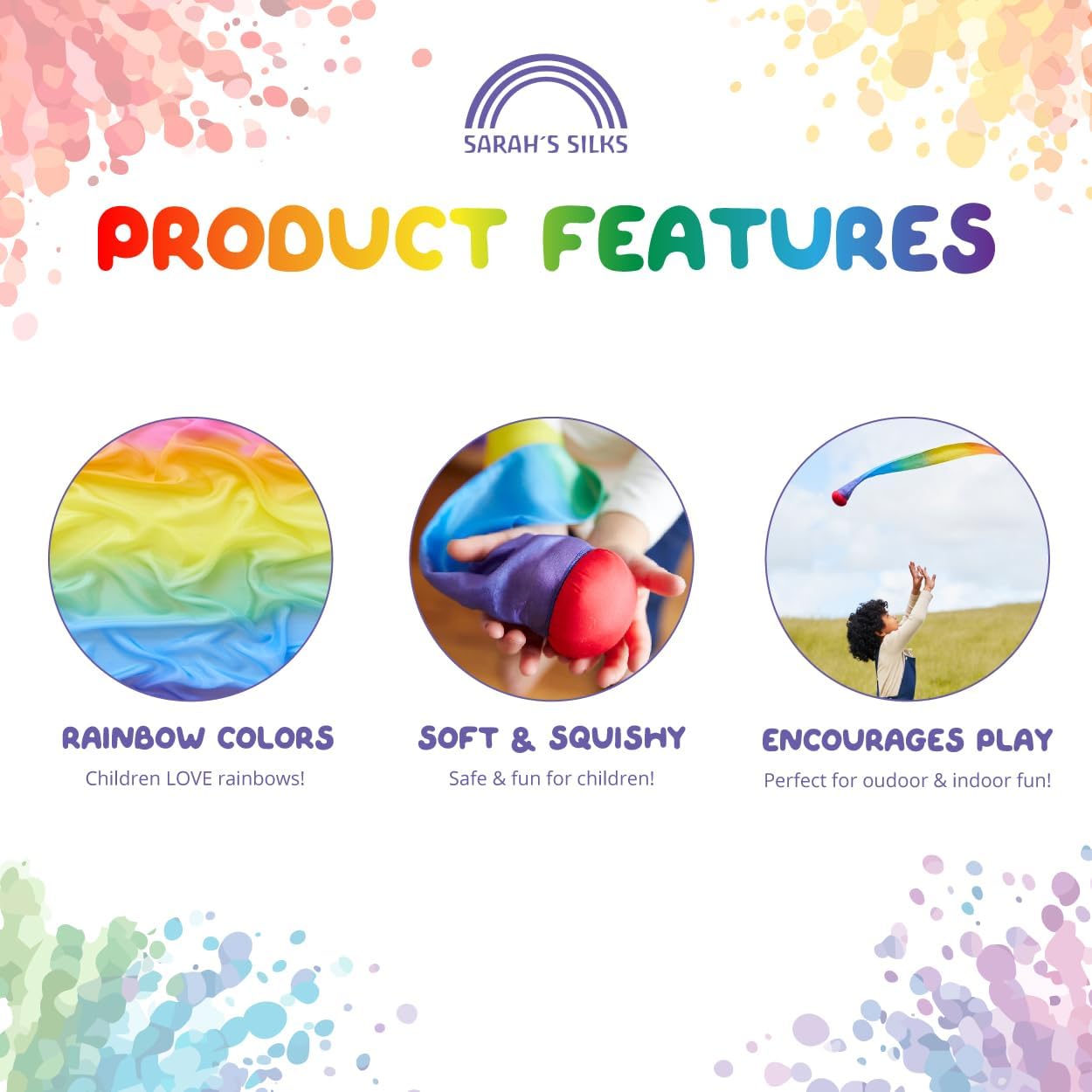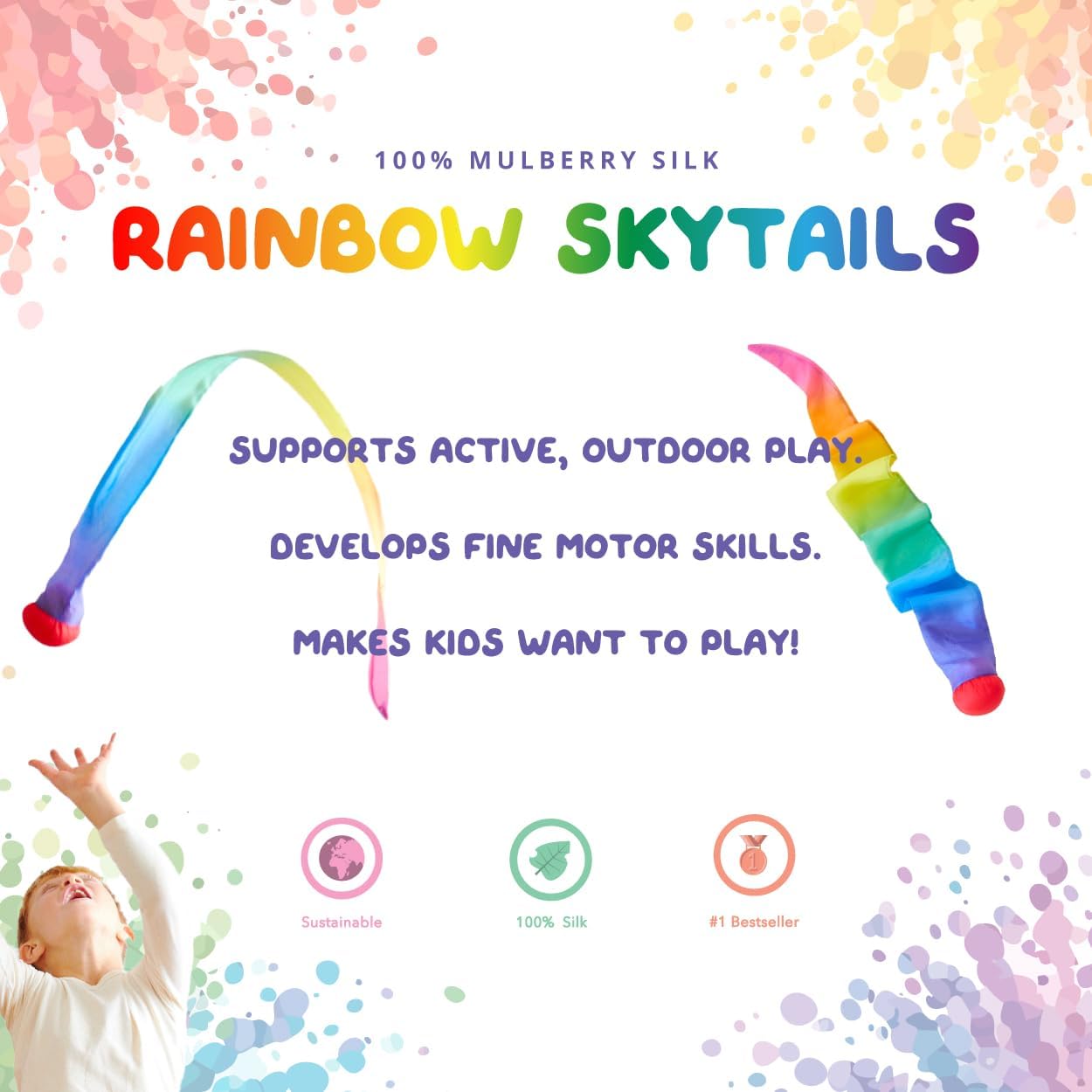 The red ball is soft and padded for children to be safe when throwing and catching. The rainbow tail is made from 100% silk, giving Skytails a handle so that even little ones can throw them!