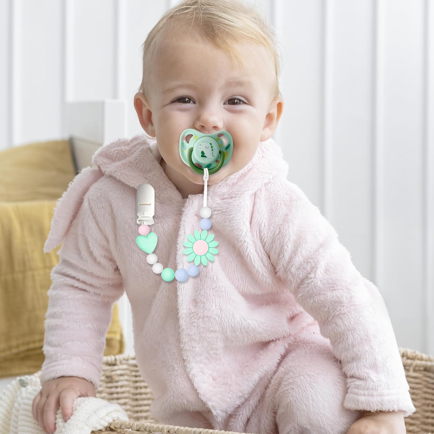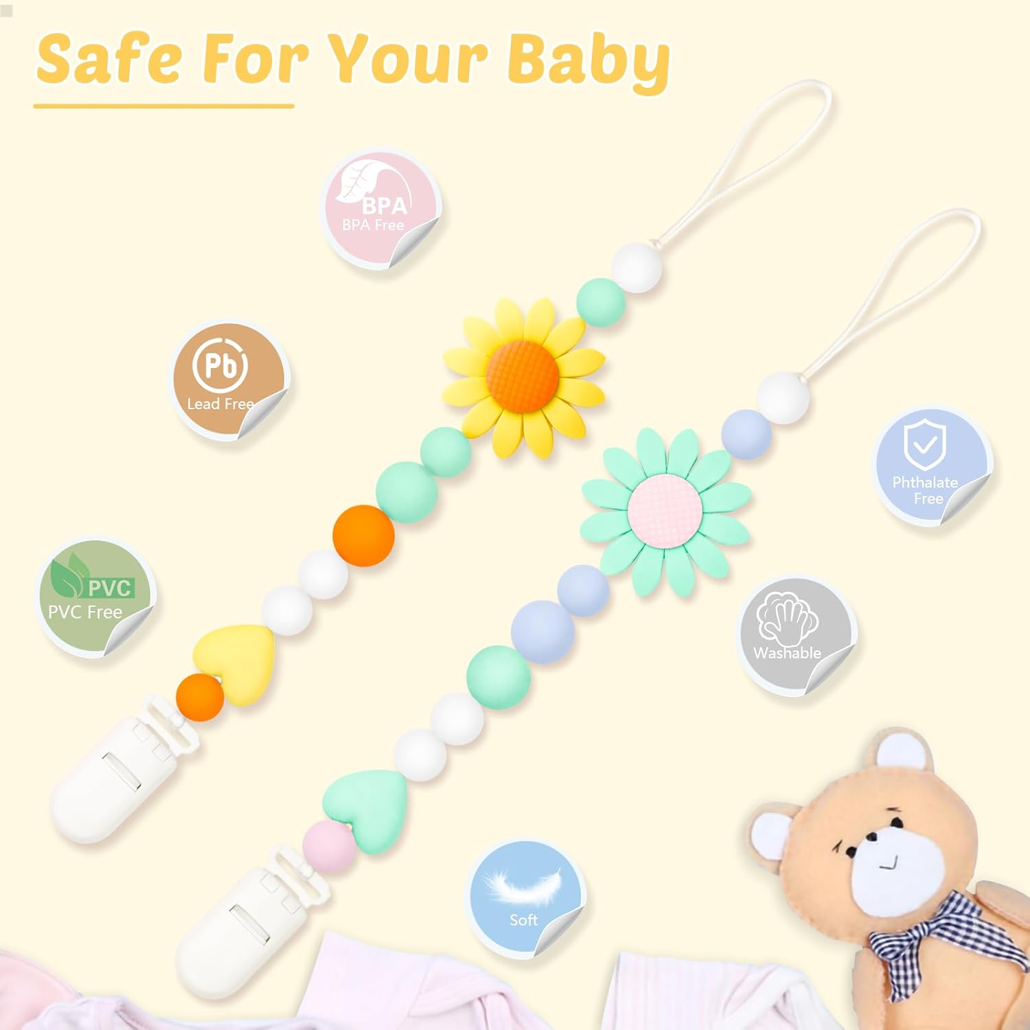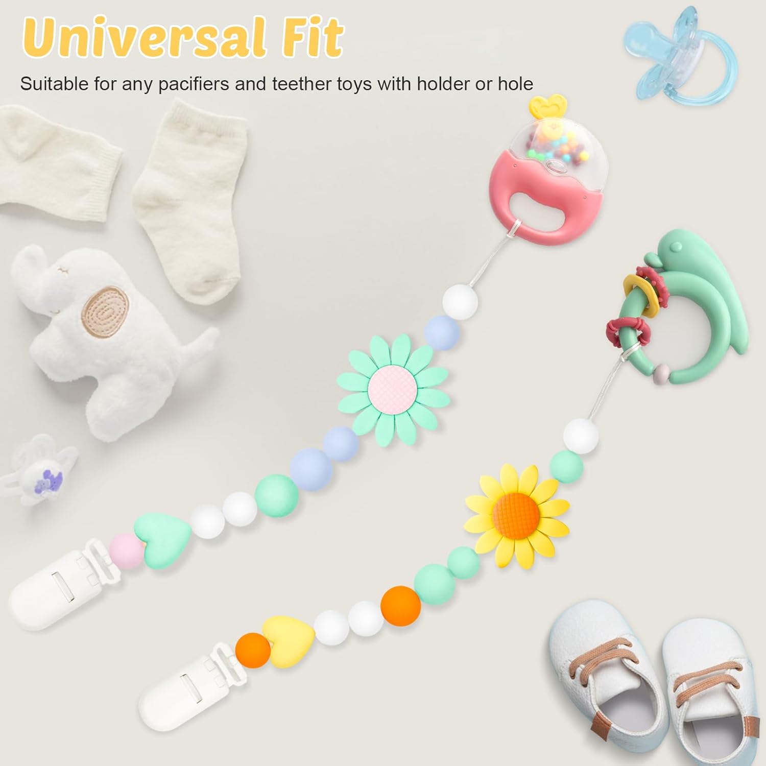 Stylish Design: These pacifier clips feature a adorable sunflower design that is visually appealing and perfect for complementing your baby’s outfits, perfect for both boys and girls. The bright and colorful pattern will attract your baby’s attention and make them look cute while keeping their pacifier close.