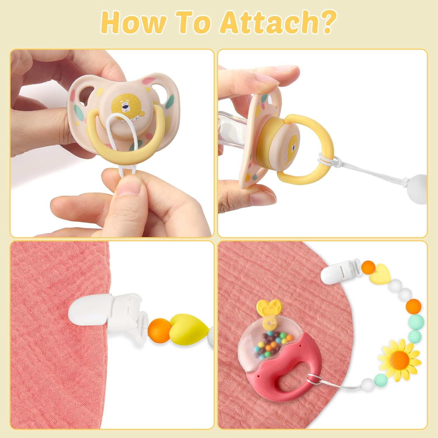 Food Grade Silicone: The pacifier clip are made of 100% food-grade smooth and soft silicone, which is BPA-free, PVC-free, lead-free, metal-free and rust-free. They are easy to clean – simply hand wash them with water or wipe with a wet cloth and use them again once they are dry.