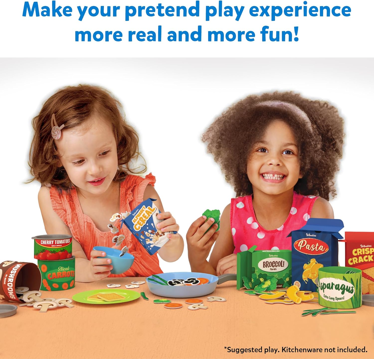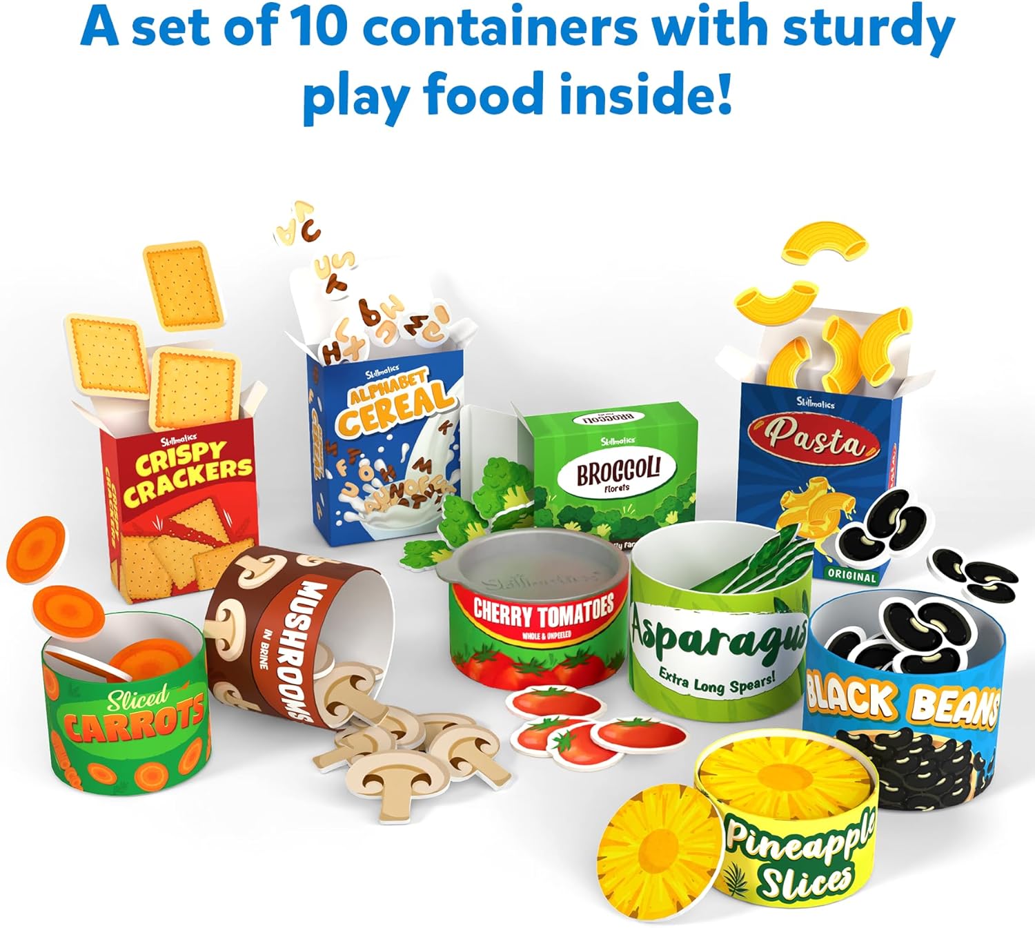 GROCERY SET WITH PLAY FOOD INSIDE!: The Skillmatics Grocery Set comes with 10 containers of 100+ pieces of sturdy play food made of thick paper board. We included broccoli florets, mushrooms, cherry tomatoes, asparagus, black beans, alphabet cereal, crispy crackers, sliced carrots, pasta, and pineapple slices.