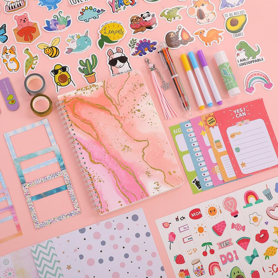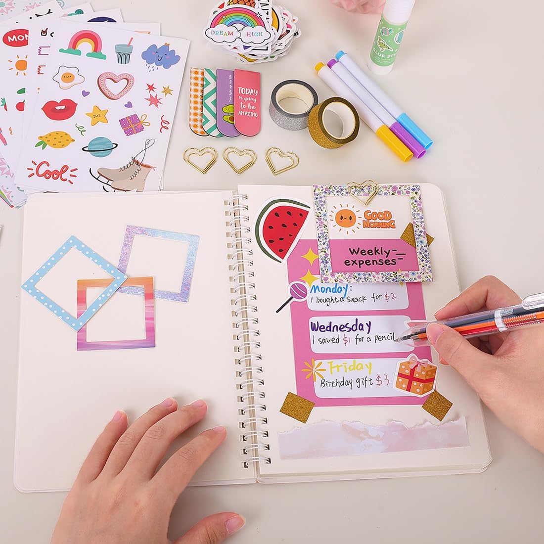 Rich Set Contents: SKYDUE DIY journal kit for girls ages 8-12 includes a comprehensive collection of accessories: 50 stickers, 6 paper frames, 5 planning notes, 6 sticker sheets, 5 paper scrapbook decorations, 4 magnetic bookmarks, 4 heart-shaped paper clips, 2 rolls of tape, 3 watercolor pens, 1 multi-color ballpoint pen, 1 glue stick, and 1 pendant. Each item is carefully selected to provide endless fun and creative possibilities