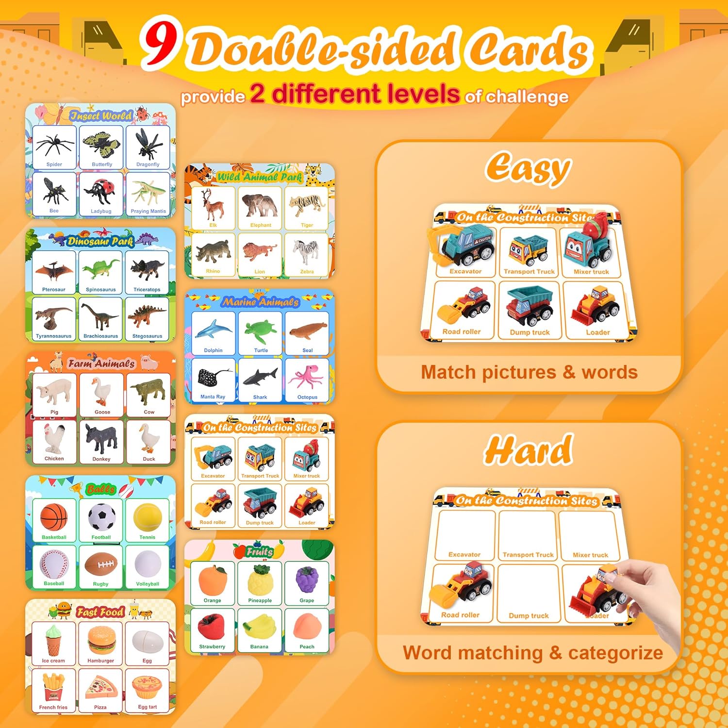 【9 Themes Sorting Toys for Toddlers】This sorting toy is a educational toy for 3,4,5 years old to improve cognition ability, problem-solving skills and fine motor skills. There are 9 themes, Include 6 wild animals, 6 farm animals, 6 engineering vehicles , 6 fast foods, 6 fruits, 6 balls, 6 sea fishes, 6 dinosaurs, 6 insects and 9 activity cards. Let kids develop their species recognition and classification skills through this fun children’s game classification series.