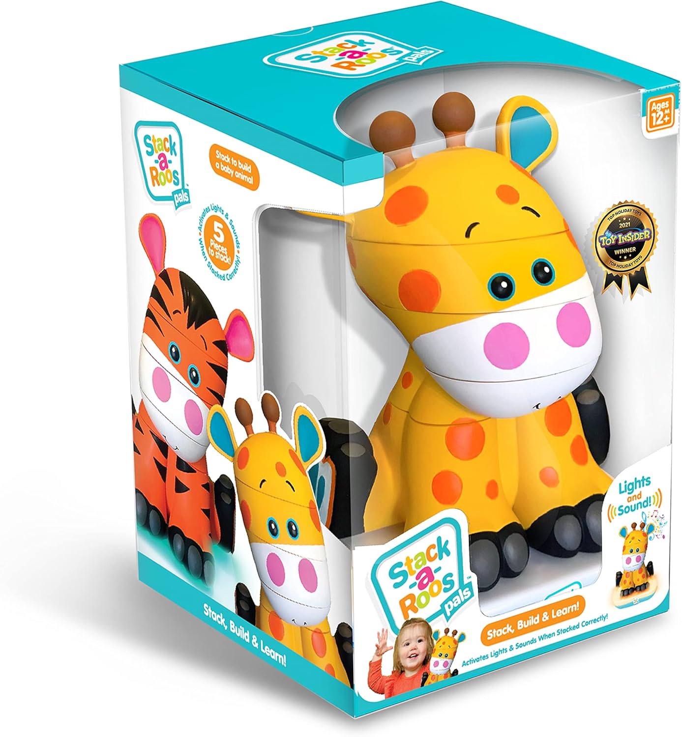 MODERN TWIST ON A CLASSIC STACKING TOWER – Our adorable baby giraffe Stack-a-Roo is a unique twist on the classic infant stacking tower. Once little hands correctly stack the chunky blocks, a farm animal is formed and a trumpet will sound to celebrate.