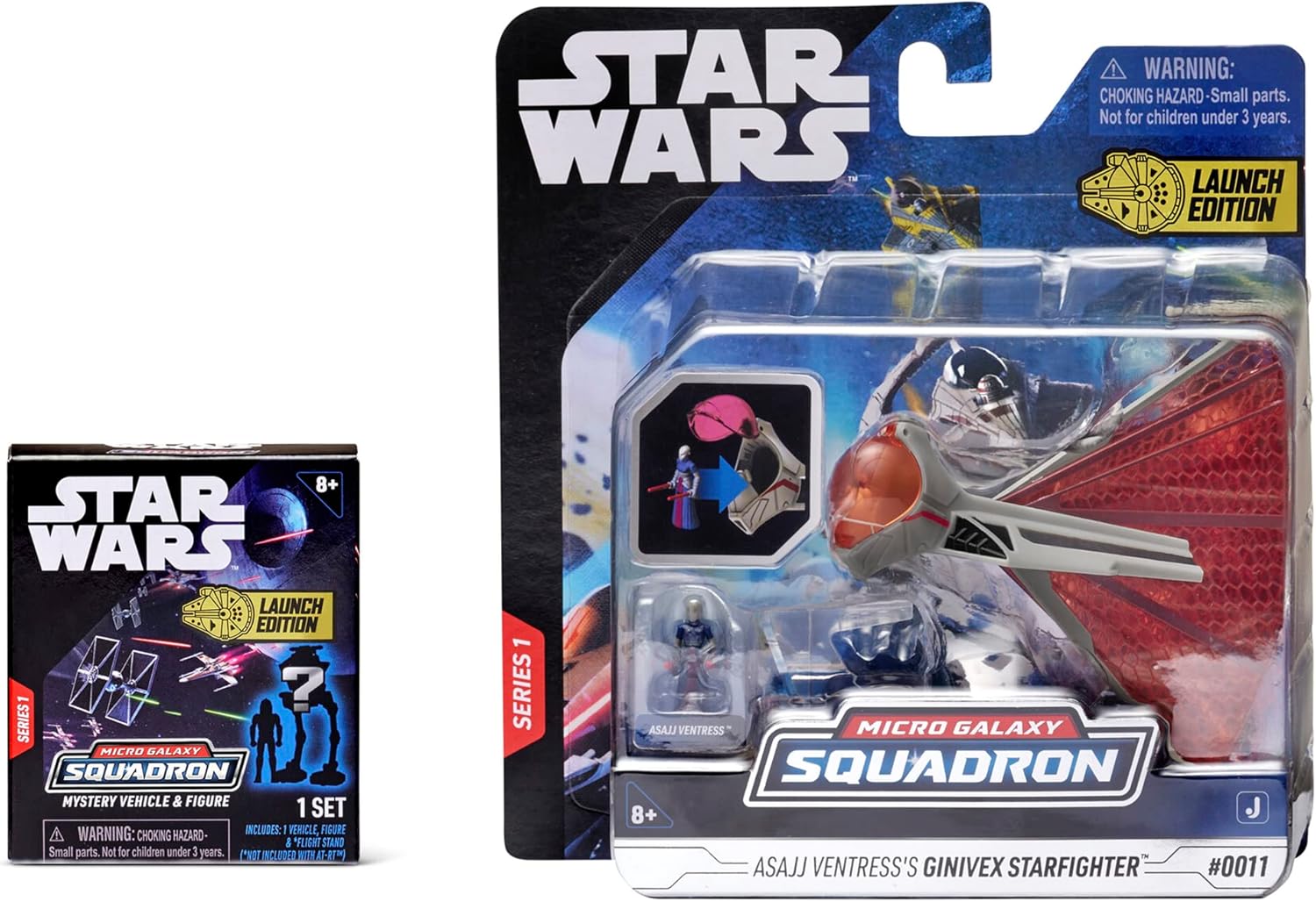 Fortify your fleet with the Star Wars Micro Galaxy Squadron Asajj Ventress’s Ginivex Starfighter Mystery Bundle. Each pack features an Asajj Ventress Ginivex Starfighter vehicle with an Asajj Ventress micro figure accessory plus one of the following Scout Class Series 1 sets: SPEEDER BIKE (ENDOR)) with SCOUT TROOPER, SPEEDER BIKE (IMPERIAL REMNANT) with IG-11, Speeder Bike (Imperial Remnant) with Scout Trooper and GROGU, DARTH MAUL’S SPEEDER with DARTH MAUL, THE MANDALORIAN’S SPEEDER (V1) with DIN DJARIN, AT-RT with CLONE TROOPER, COBB VANTH’S SPEEDER with COBB VANTH, or JOBEN T-85 SPEEDER with AHSOKA TANO. All vehicles are incredibly detailed, authentically scaled, and ready for action or display on the included flight stand (not included with AT-RT). Officially licensed Star Wars product from Jazwares. Ages 8+