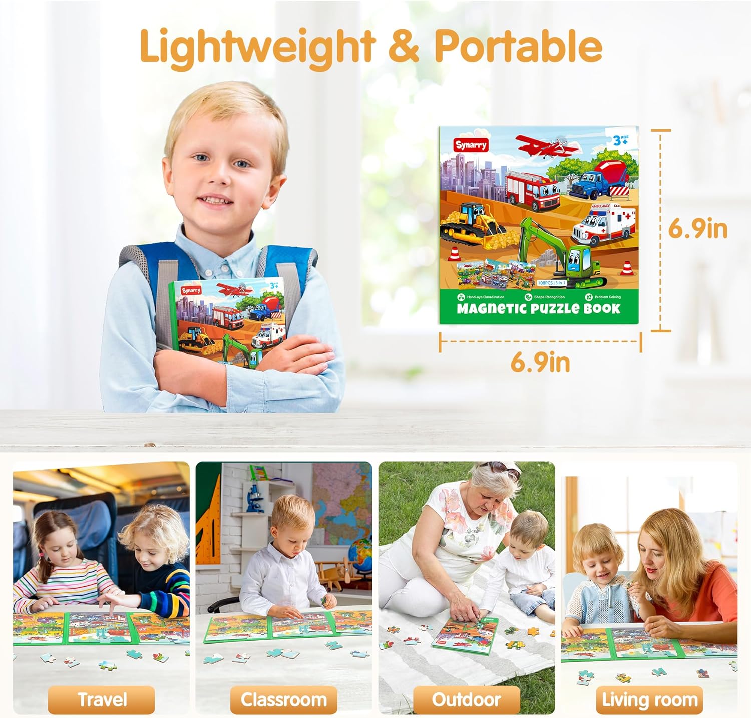 TRANSPORT PUZZLES FOR KIDS: Kids love Vehicles and puzzles! The magnetic vehicle puzzles set includes three 36-piece advanced version puzzles with imaginative and exciting Construction Site Excavators Urban Farm Transport scenes, full of fun and challenge. Welcome to the world of transports, with different scenes to provide a more fun time for children. Completed jigsaw puzzles measure 6.9” x 6.9” each.
