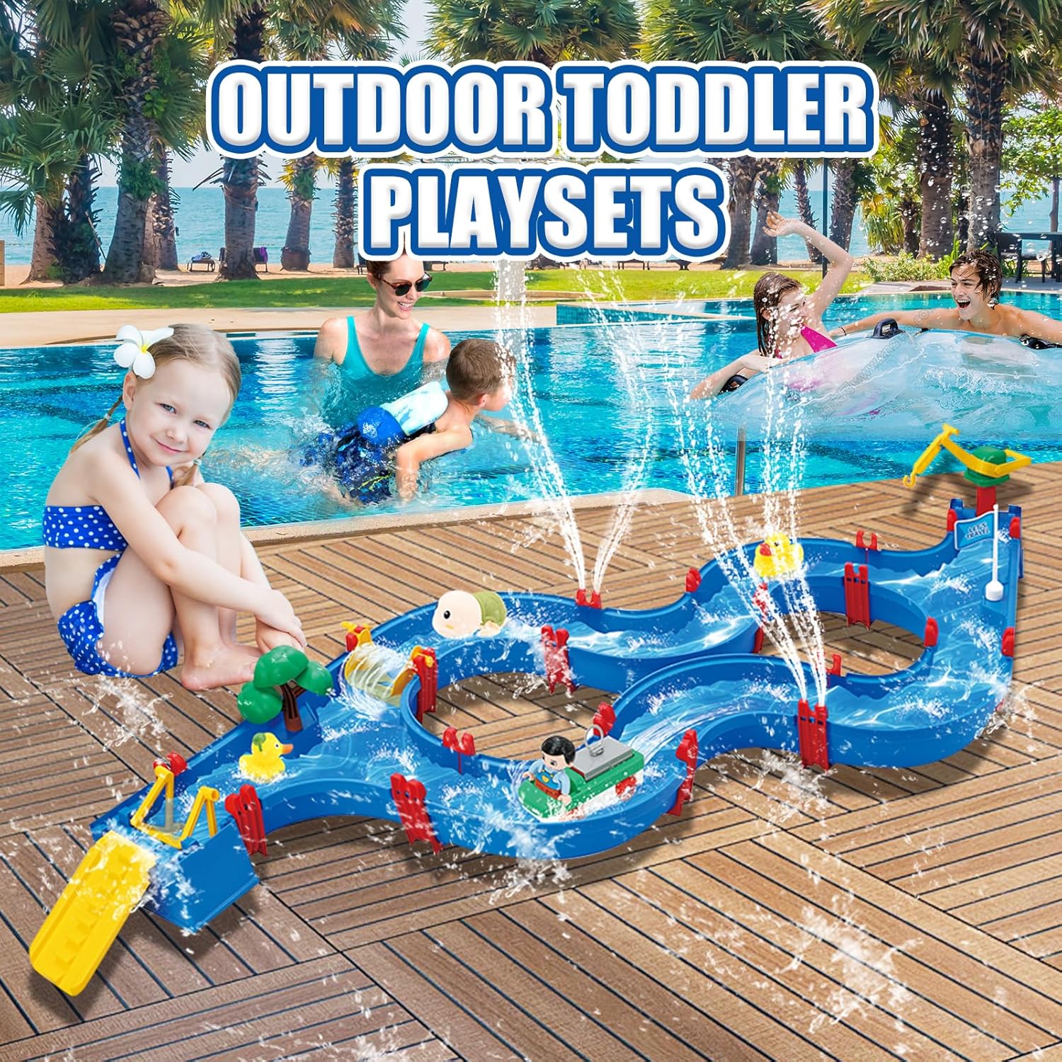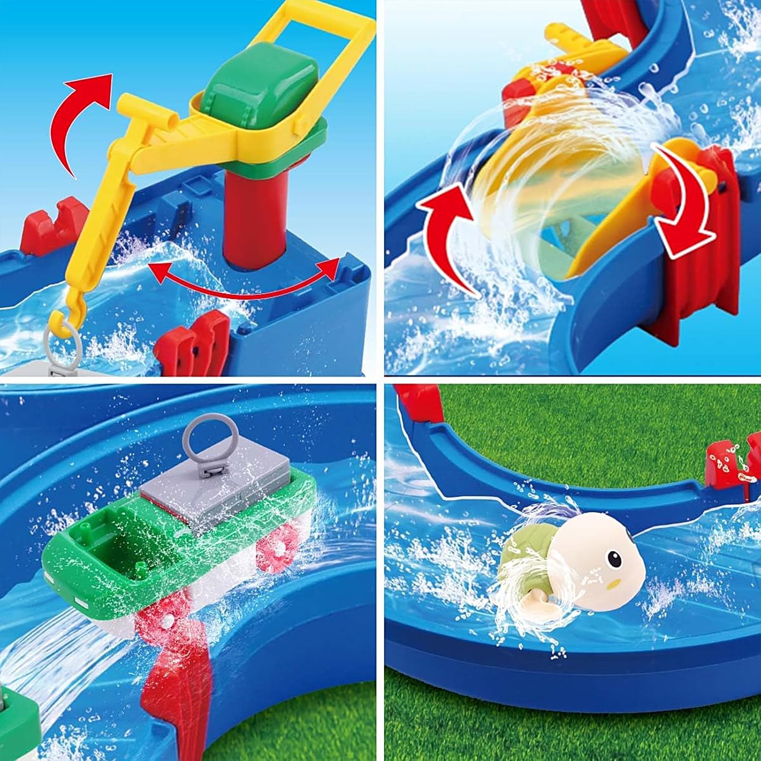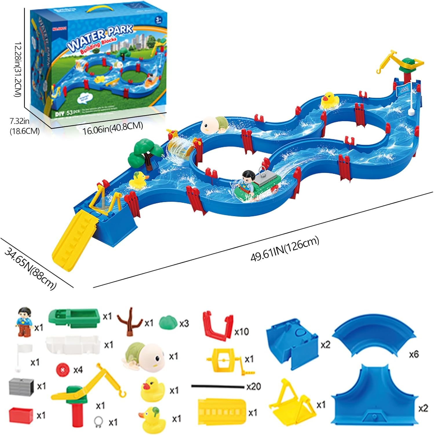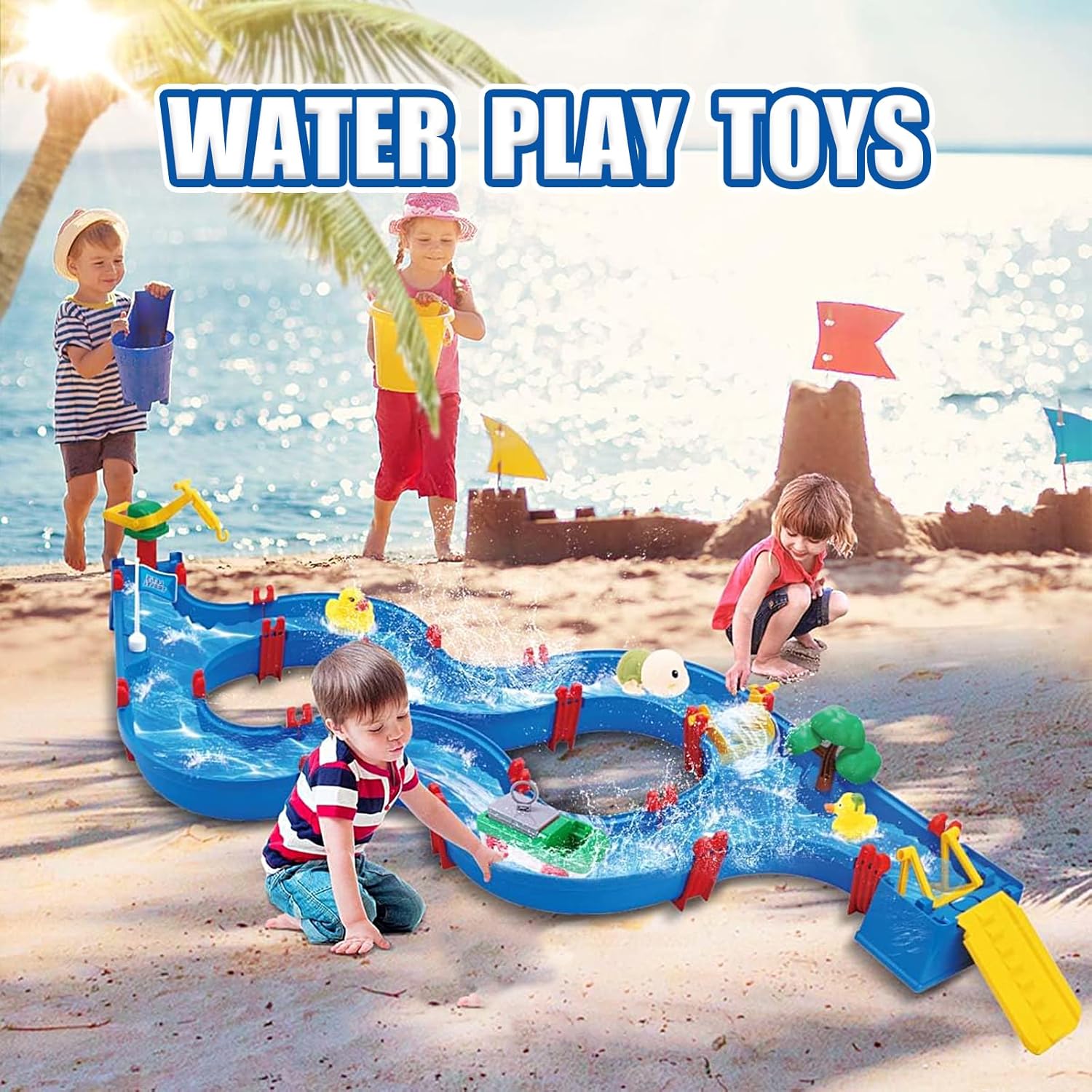 Water Play Set: This summer water kids toys for kids outside toy includes track, movable sluice, water gas pedal, gear, cargo boat, speedboat, waterproof adhesive and so on. We have included assembly instructions for kids to explore and build together