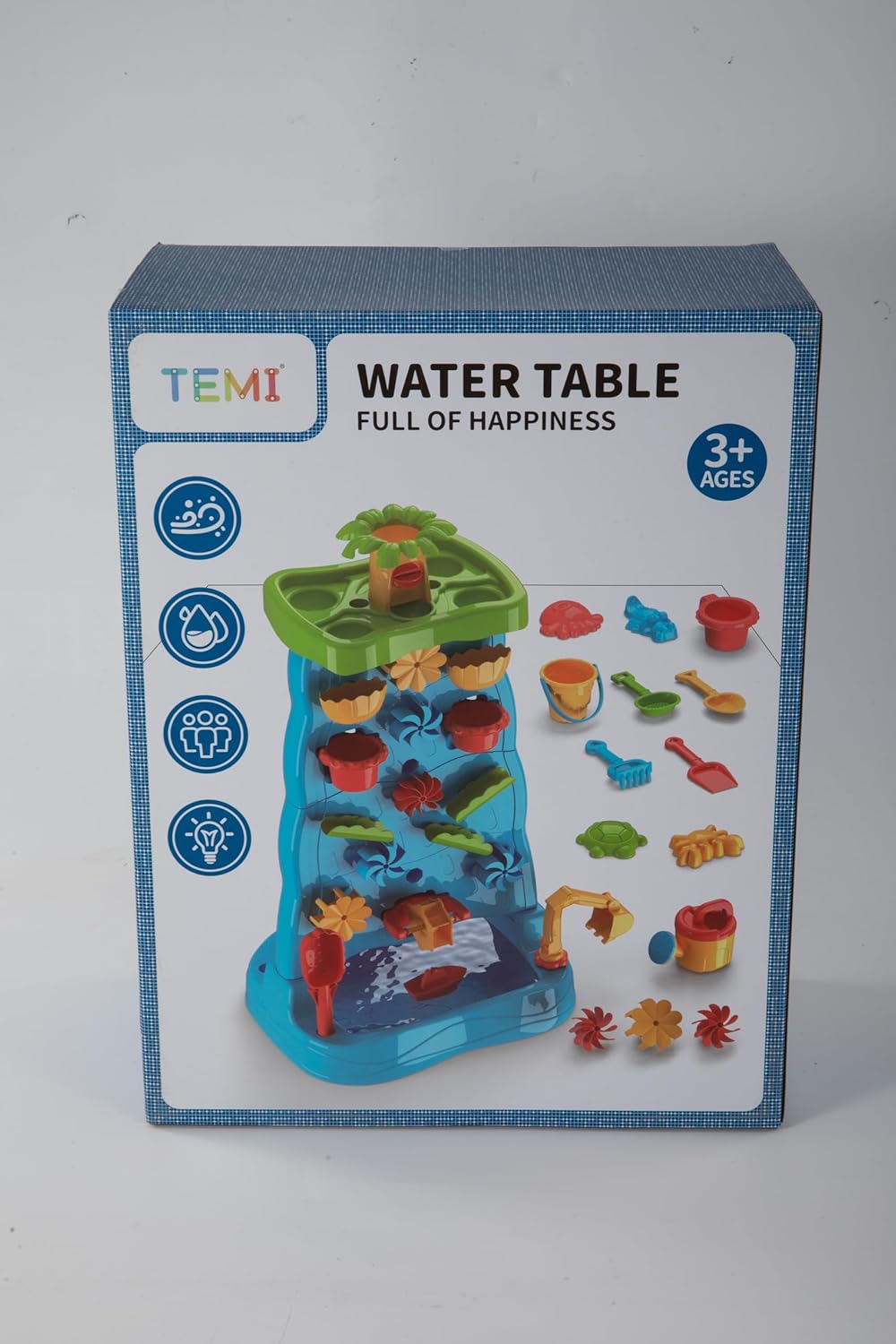 32 pcs Accessories Water Table Wall: This waterfall maze-like wall water (16.2*12.2*30.7in)features single-sided or two-sided design for installing water parts to create different STEM waterfall games. Water table, water tower, watermill, flower-shaped filler, ramps, spoon, watering pot, boat, bucket, molds, sieve, shovel and rake etc..