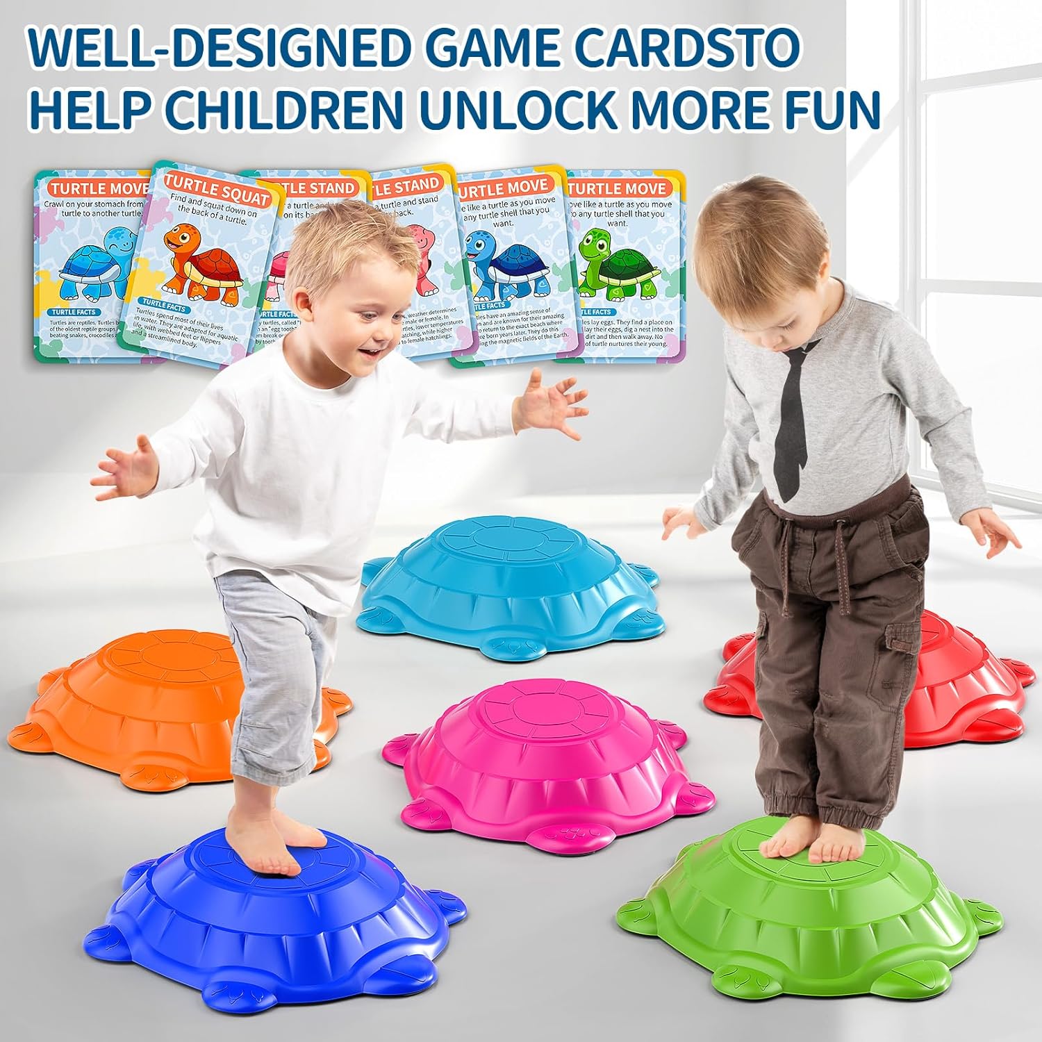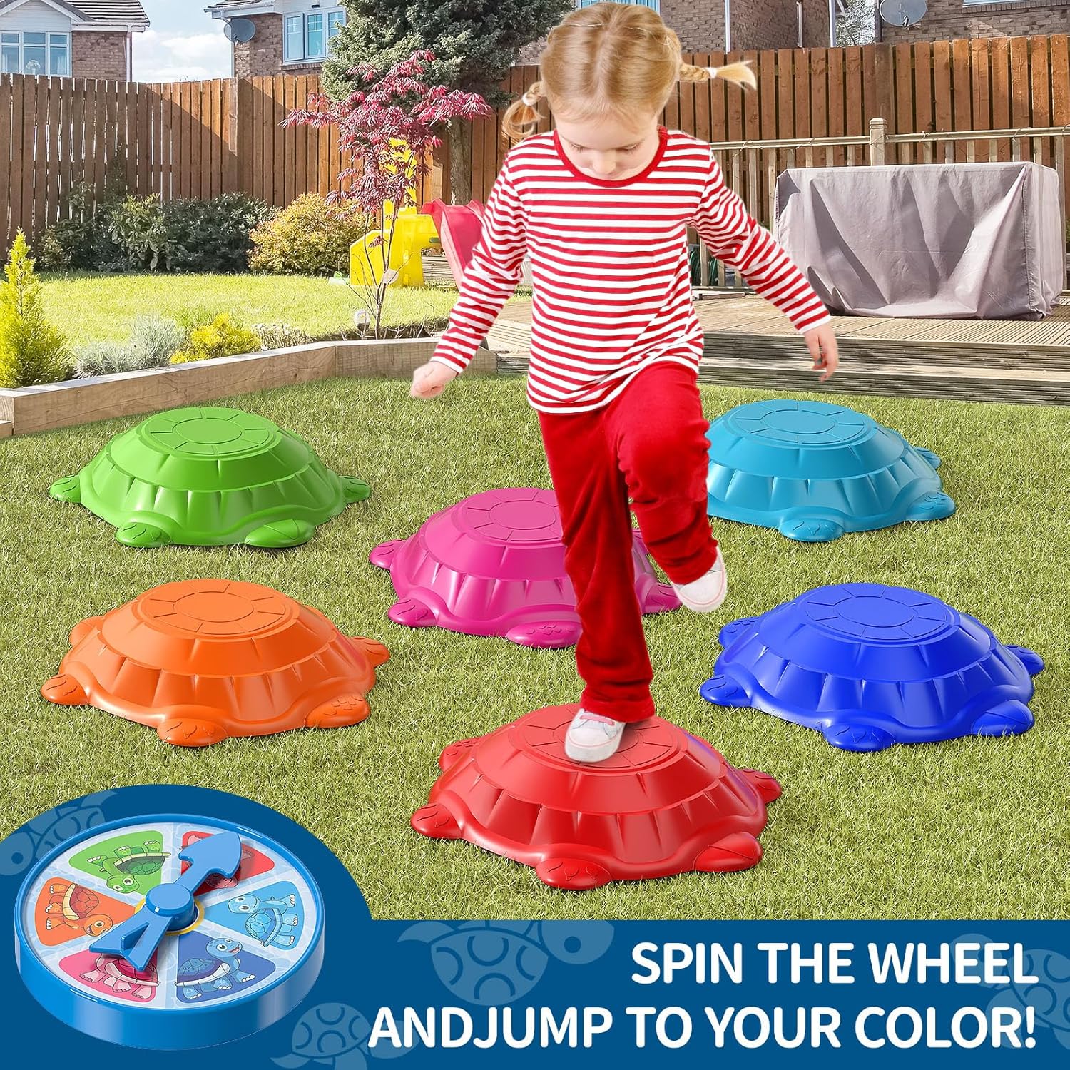 What’s Included: Kids jumping stones includes 6 turtle river stones (12.5×2.9×11.6 in) with 6 colors (red, rose red, green, orange, dark blue, light blue), 1 game turntable (3.3×3.3 in), 24 activity cards (2.4×3.3 in), 30 Non-slip rubber foot pads and 1 storage bag (17.7×23.6 in) for easy to carry. The toddler sensory toy for kids over 3 years old.
