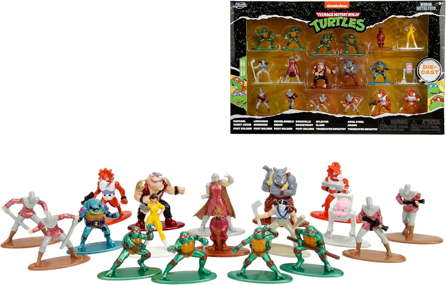Add to your collection of iconic characters with the TMNT nano figures! This 18 pack comes with all your favorite characters. Featuring authentic character likeness, these 1.65” figures made of 100% die-cast are sure to be a stand out in any TMNT collection.