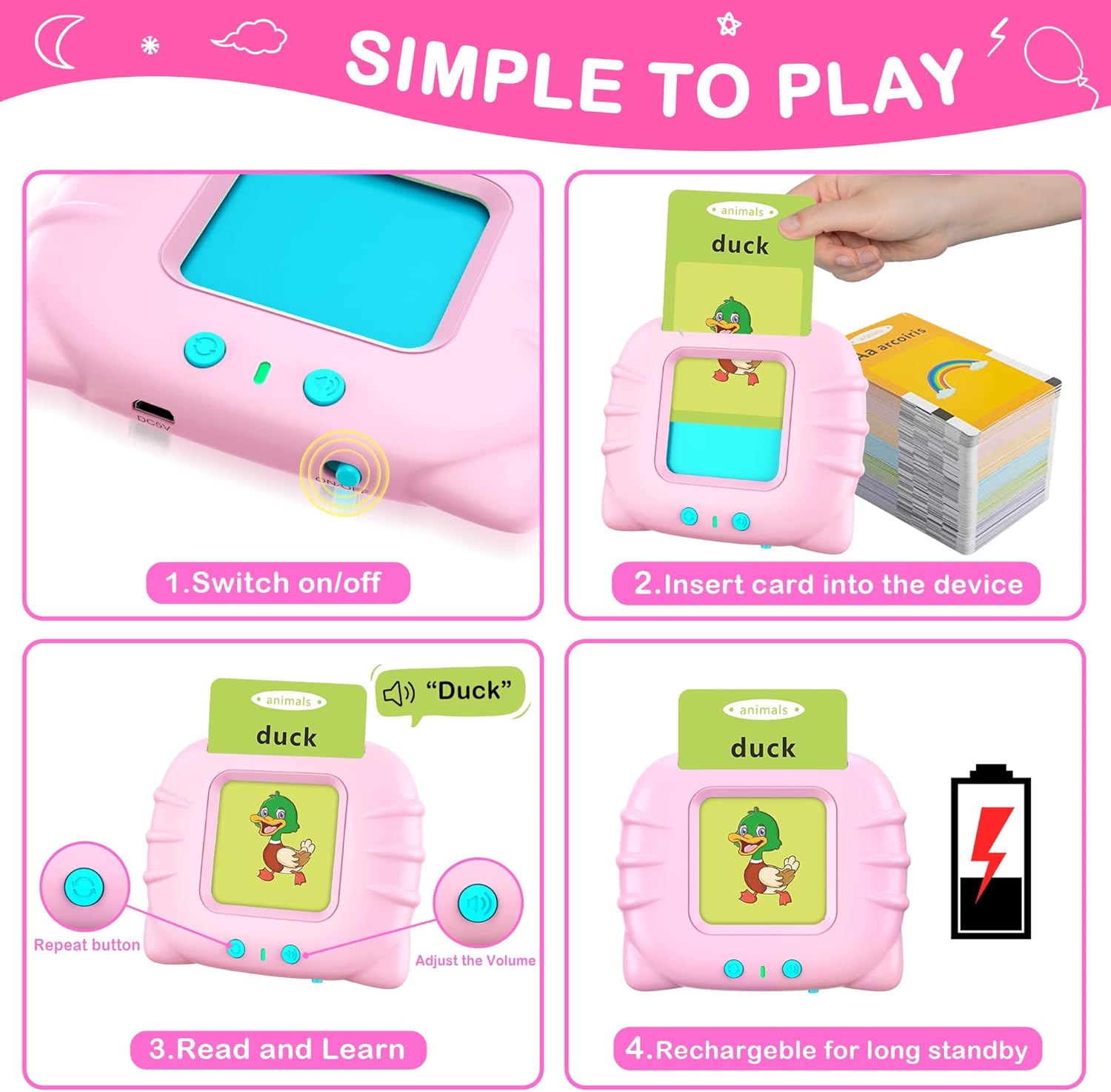 ✅ 【Easy to Use】Put the card into the card reader’s slot, the card reader will pronounce the sight words quickly. When an animal card or transport card is inserted the card reader will play real animal or transport’s sound. Press the repeat button to repeat the pronunciation and sound effect. This learning toys for toddlers 2-4 years is very easy for toddlers to hold. Volume is adjustable, a portable bag is provided for easy storage of the cards and card reader.