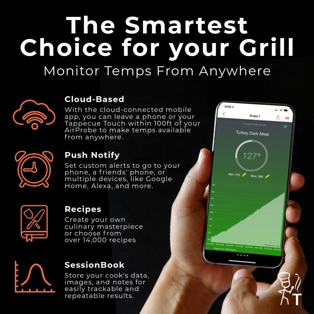 PREMIUM QUALITY MEAT BBQ THERMOMETER: Tappecue Touch has a number of probe options and all the add-ons you need for a great life. Made and supported in USA with TRUE WI-FI which lets you connect and view your settings remotely, you can read up to 8 temperatures with this grill Thermometer.