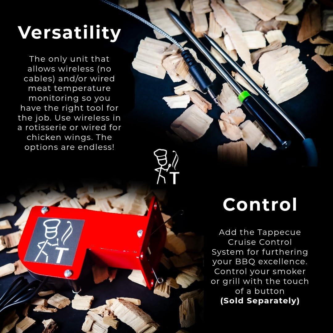 Tappecue’s unique features include its ability to use wired or wireless probes and/or upgrade to the Cruise Control System to control your smoker or grill.