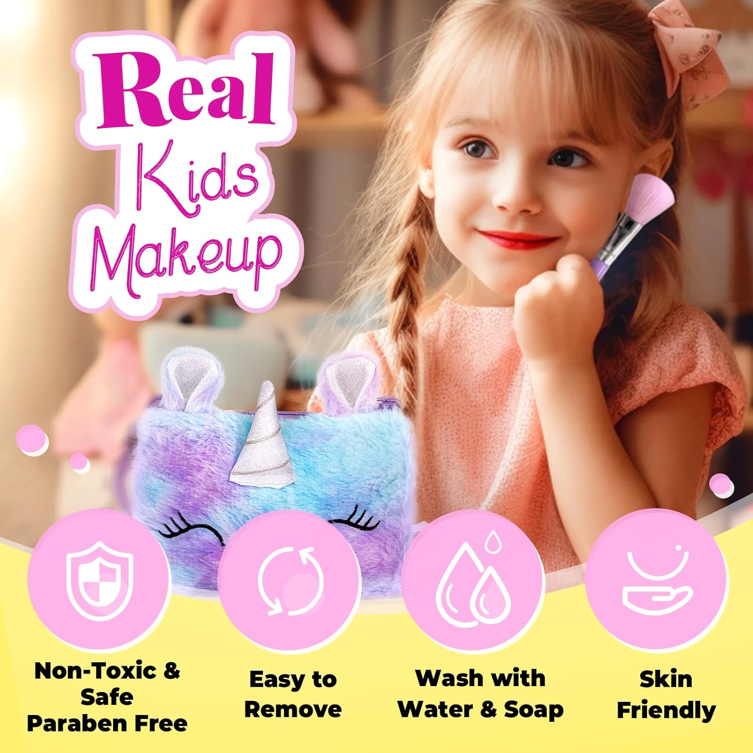 【Great Gift】 Looking for a birthday or holiday gift that consistently brings smiles to little girls’ faces? Prepare for jump-up-and-down excitement and little girl squeals when you gift this umicorn makeup for girls to your special little one any time of the year