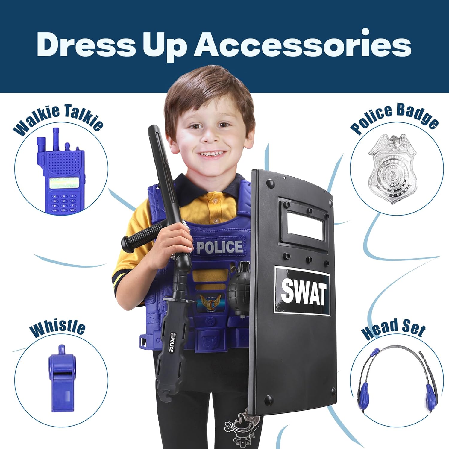 15 PIECES SET: Includes pretend play face mask, combat vest, shield, handcuffs with keys, baton, knife, police badge, watch, whistle, binoculars, walkie talkie, headset. Large Play Shield Measures 18″ x 12″