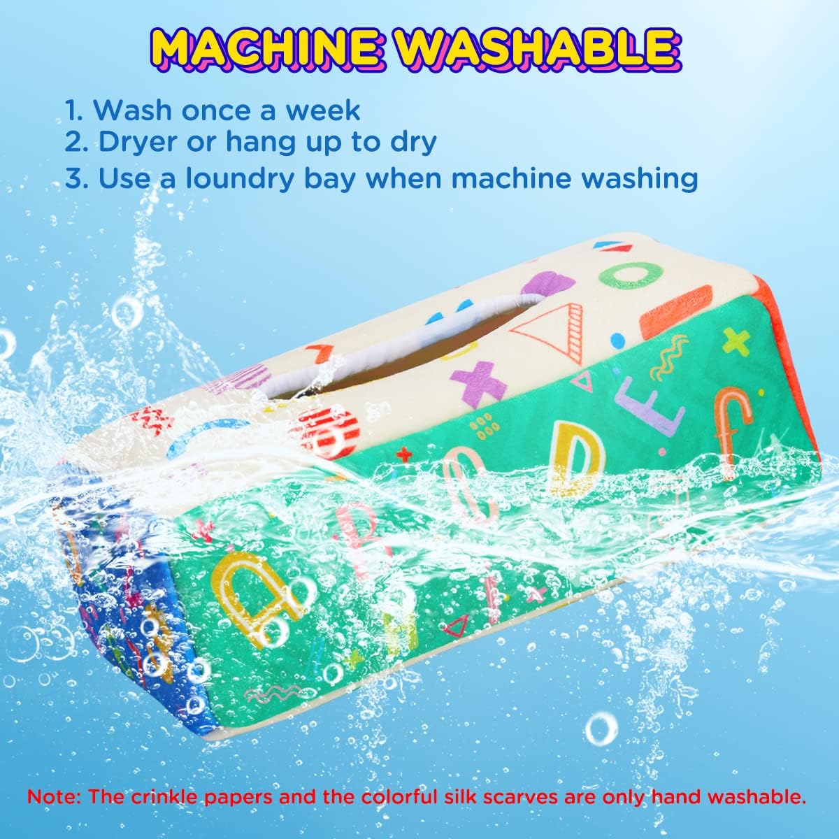 Safe Material and Easy to Clean: Baby like to put everything they got in their mouths. So we take the safety of toys very seriously. This baby toy is soft to touch and chew, easy to use by baby without getting hurt. The toys are made of non-toxic material. Besides, they are easy to clean so that can be carried anywhere and the colors and graphics do not easily fade. Note: The tissue box is machine washable but the crinkle papers and the colorful silk scarves are only hand washable.